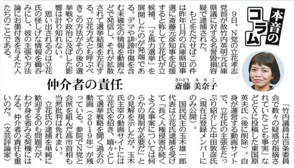 東京新聞、斎藤美奈子氏のコラムです。 立花容疑者だけでなく、情報の仲介者の責任も重いと断じている。 東国原英夫、中田敦彦に始まり、立花容疑者に選挙戦略を聞く動画を紹介している国民民主党の玉木雄一郎、N国党の会派を組んだ高市早苗なども袈裟懸けに切って捨てた。