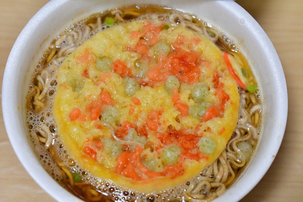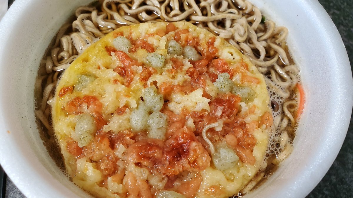 かぐやさんと同じように食べようとしたのに 天ぷらをふやかしてしまって箸で持てませんでした😭 考えてなかった🥺次回リベンジ 皆既月食待機しながら卵トッピング月見そば🍳🌕 #かぐや様と月見と緑のたぬき