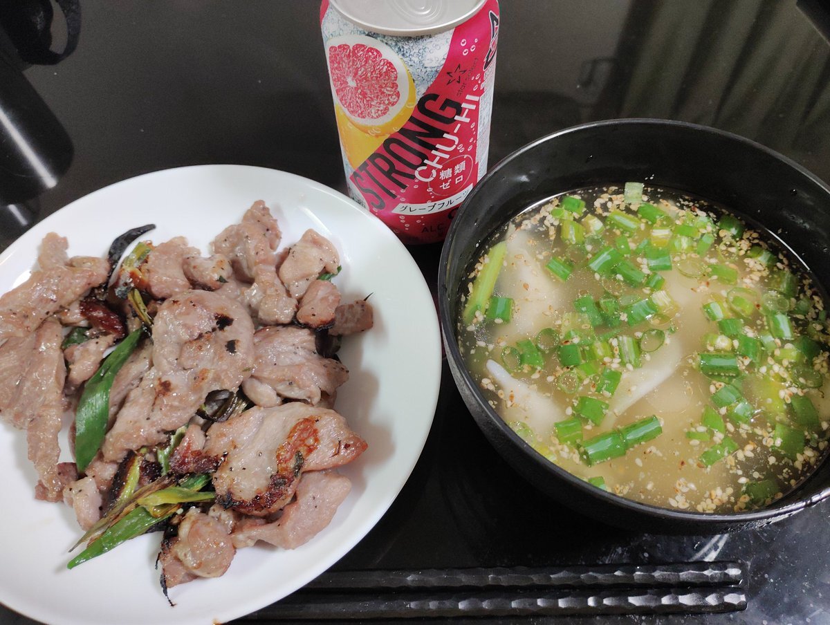 今日の #料理 です。#豚肉 #カシラ #ネギ塩 焼き、#水餃子#中華スープ です。豚肉は #味付け肉 です。#青ねぎ を加えて #魚焼き機 で焼きました。#温度 が高いので柔らかく仕上がります。#スープ#鶏ガラスープ #ゴマ #ごま油#中華風 に仕上げました。ゴマが芳ばしくておいしかったです。 pic.x.com/K0dVMGfWv2