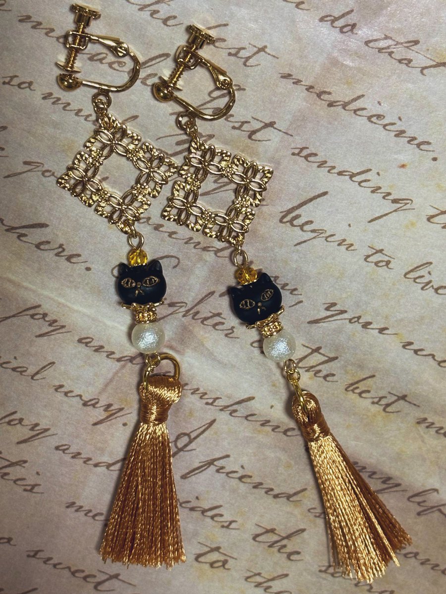 久々の新作投稿✨ 黒猫さんの中華風タッセルイヤリング(橙色)が完成しました🐈‍⬛✨ 花模様の透かしパーツ、座金で華やかなデザインにしてみました💐 #タッセルイヤリング #中華風 #黒猫 pic.x.com/pgO5v7mjo1