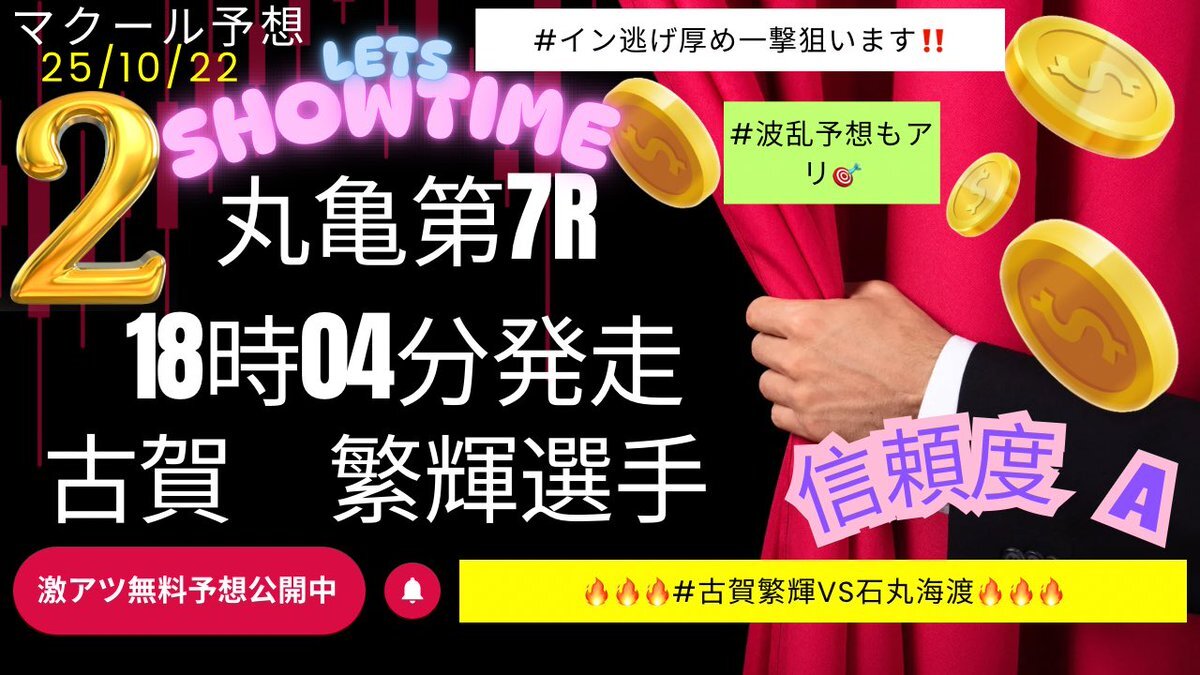 丸亀7R(18:04発走) 信頼度Aランク💎 古賀繁輝VS石丸海渡のA級対決⚡️ イン逃げ厚め一撃勝負‼️ 波乱含みのSHOWTIME🎭 note.com/makuulu__sense… #丸亀予想 #無料予想 #競艇予想 pic.x.com/H3BhH9O0oC