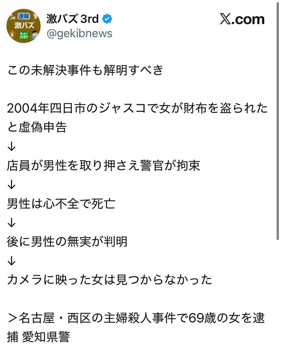 愛知県警はわざと犯人を捕まえないの?仕事が無能すぎでしょ😡 犯人は隣人、被害者夫の同級生なのに、26年間も捕まえられなかった立場でクイズ出してる場合?💢 四日市ジャスコで冤罪の男性を取り押さえて4んじゃった事件もあるらしいね。 これ、警察が頃したってことよね?💢 #主婦殺人事件 pic.x.com/DAyPu8H9Sz x.com/livedoornews/s…