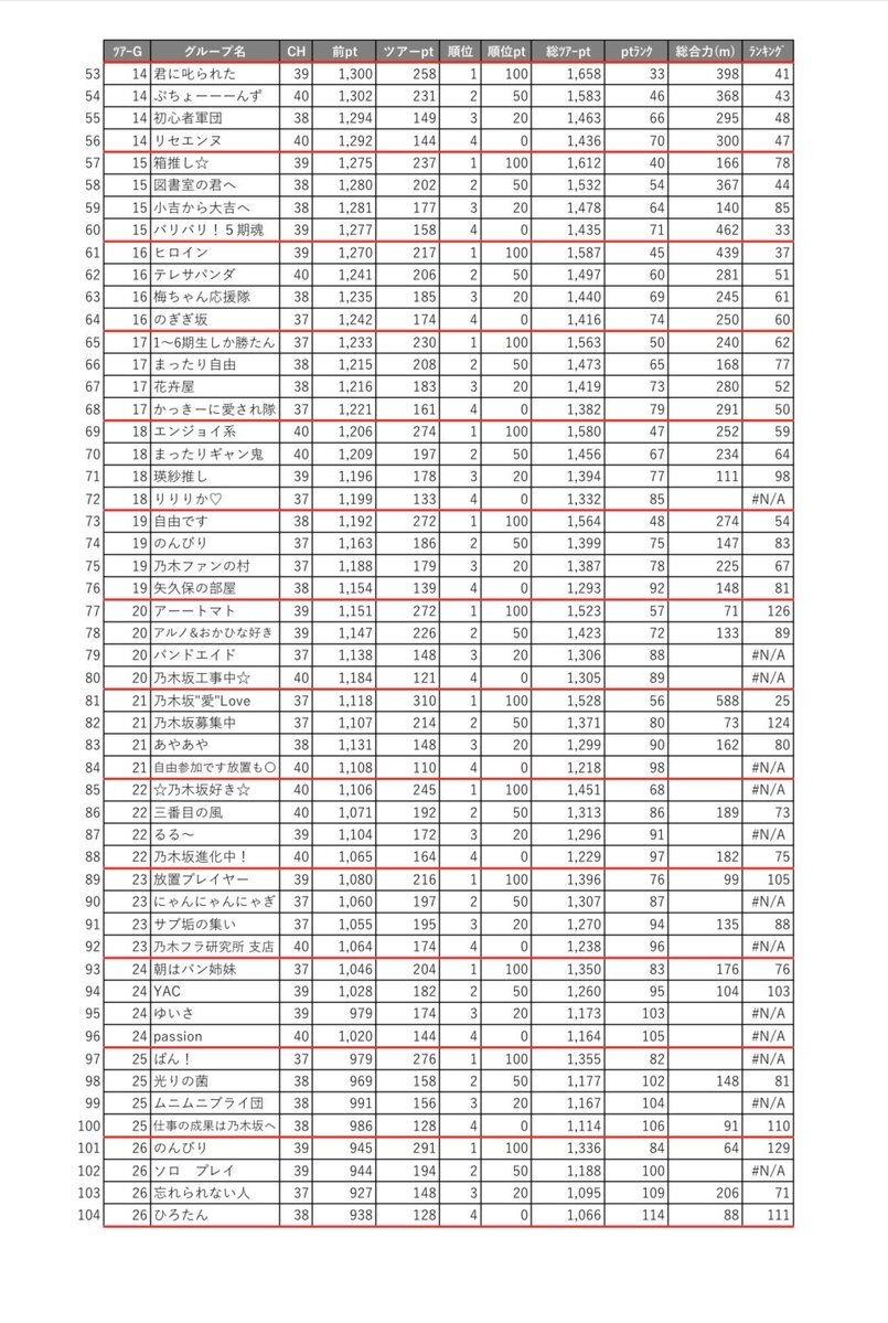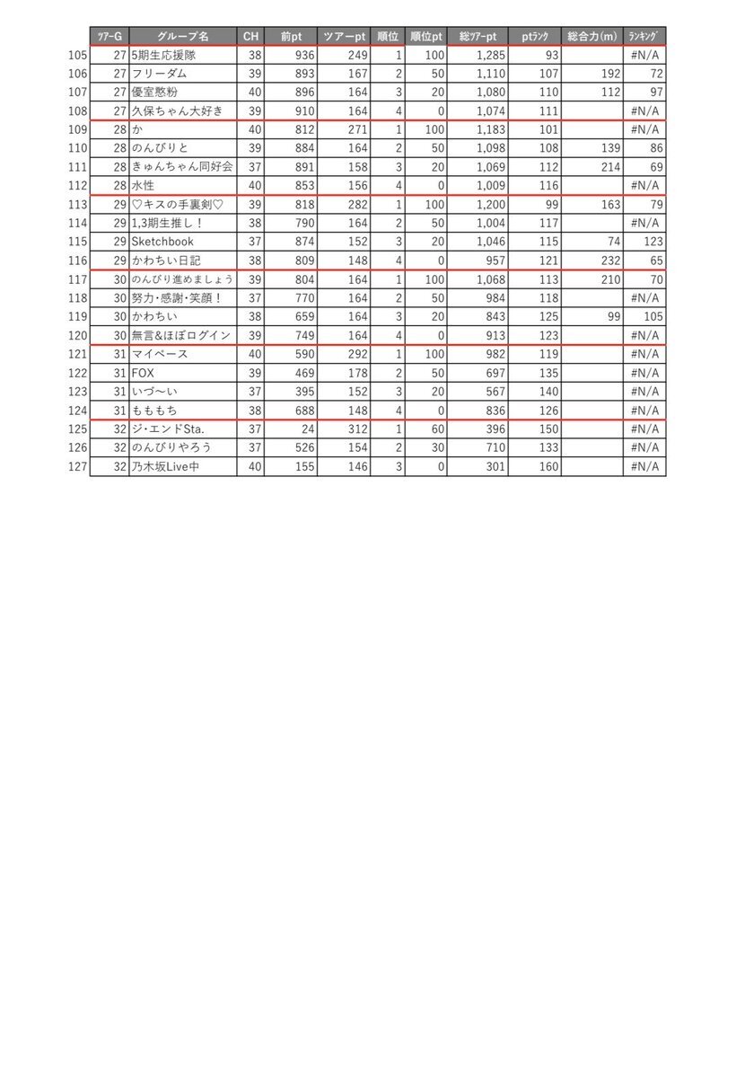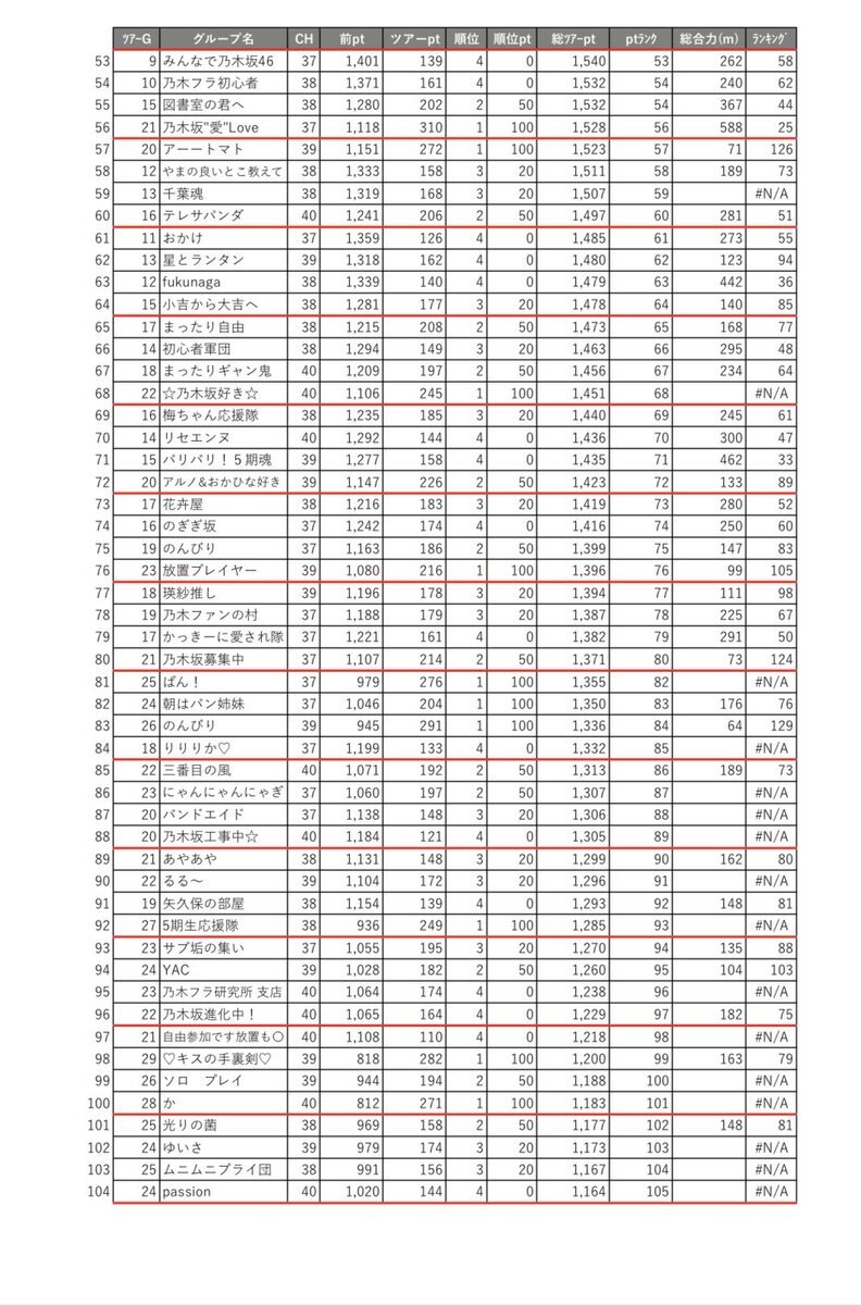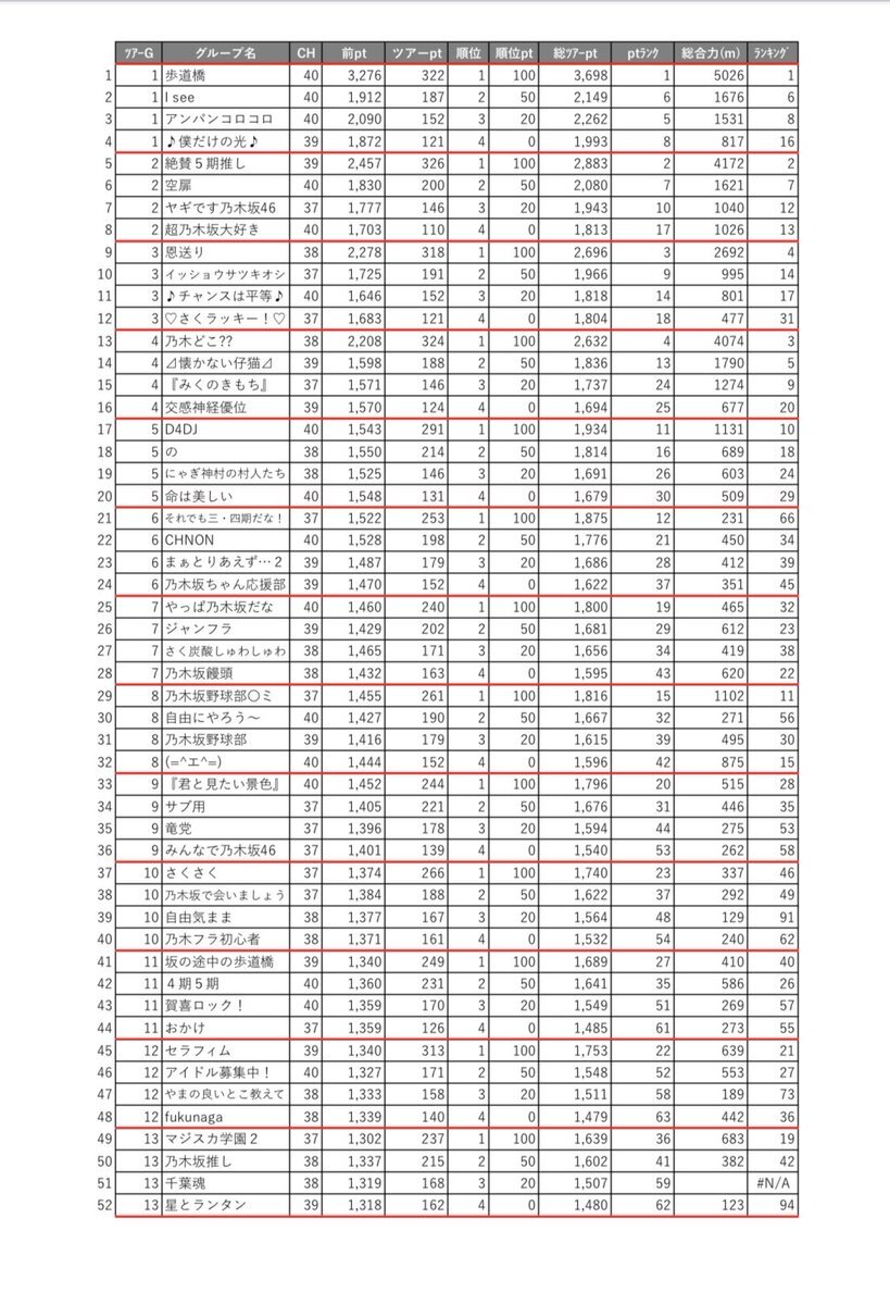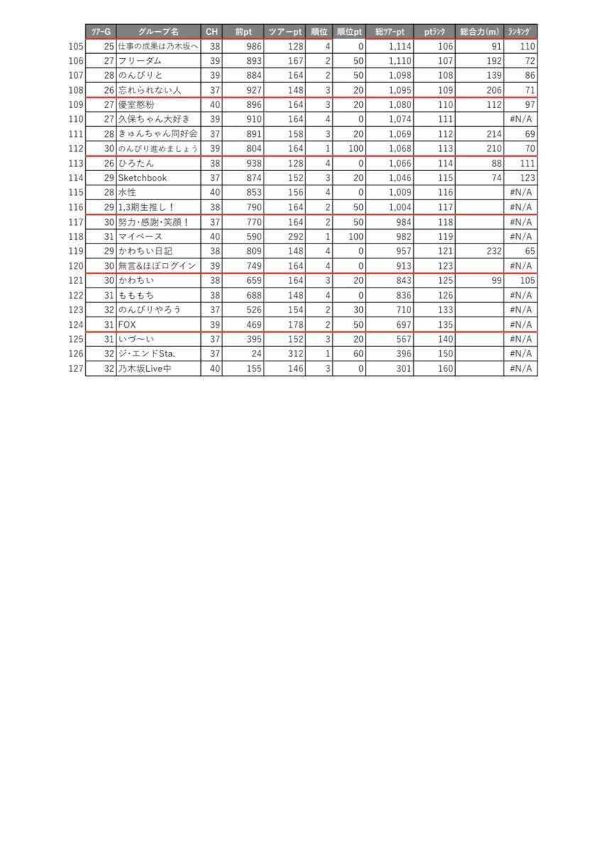 乃木フラ グループ対抗ツアー シーズン#23 G1-G6 ランキング 202511124-20251129 ポイント集計結果 docs.google.com/spreadsheets/d… 数字が間違っていたら許してください🙏 #乃木坂的フラクタル #乃木フラ