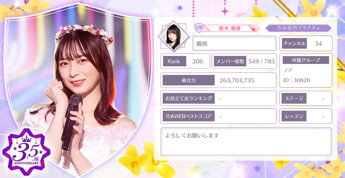 【乃木フラ37ch】みくのきもち 総合力1000万↑の移籍者1名募集! ●グループ対抗ツアーで、毎日リアタイか事前防衛のどちらかができる方 ●Discordで作戦のやり取りができる方(できれば) 統率の取れたフレンドリーなチームです。一緒に上位を狙いましょう! #乃木坂的フラクタル #乃木フラ #37ch