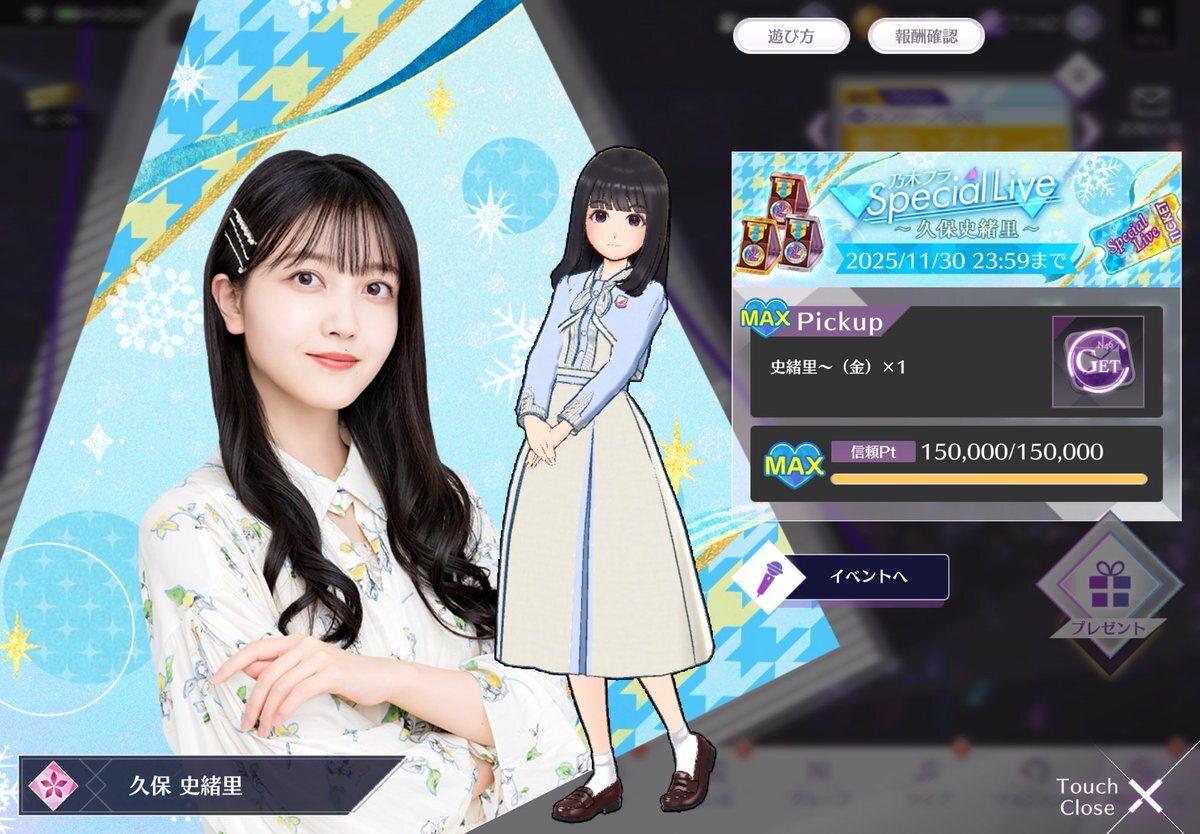 🔖まもなくイベント終了🔖 期間限定イベント「乃木フラSpecial Live~久保史緒里~」は11月30日23:59迄⏰ 抽選券を集めると、 久保さんの直筆サイン入りチェキ📷や直筆サイン入りTシャツ👕が当たるチャンス✨ 詳しくはゲーム内をチェック! #乃木フラ pic.x.com/i0HdBB1kZe
