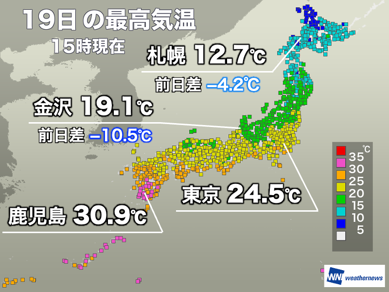 <北海道〜九州北部で気温低下> 今日は北海道〜九州北部を中心に、昨日より気温が下がりました。10℃以上、低い所もあります。 一方、上空に暖気が残り、午前中に日差しが届いた九州南部は30℃以上の真夏日と、まだ季節外れの暑さの所が多くなりました。 weathernews.jp/news/202510/19…