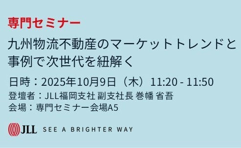 【展示会】本日10/8(水)から2日間九州次世代物流展に出展しております!お近くにお越しの際はぜひお立ち寄りください。 会場:マリンメッセ福岡A ブース番号:A1・8 専門セミナー:10/9(木)11:20 - 11:50 セミナー会場A5 (SA5-9) 来場事前登録 co.jll/3Wspys9 #JLL #九州次世代物流展 pic.x.com/nrzQCHAlcP