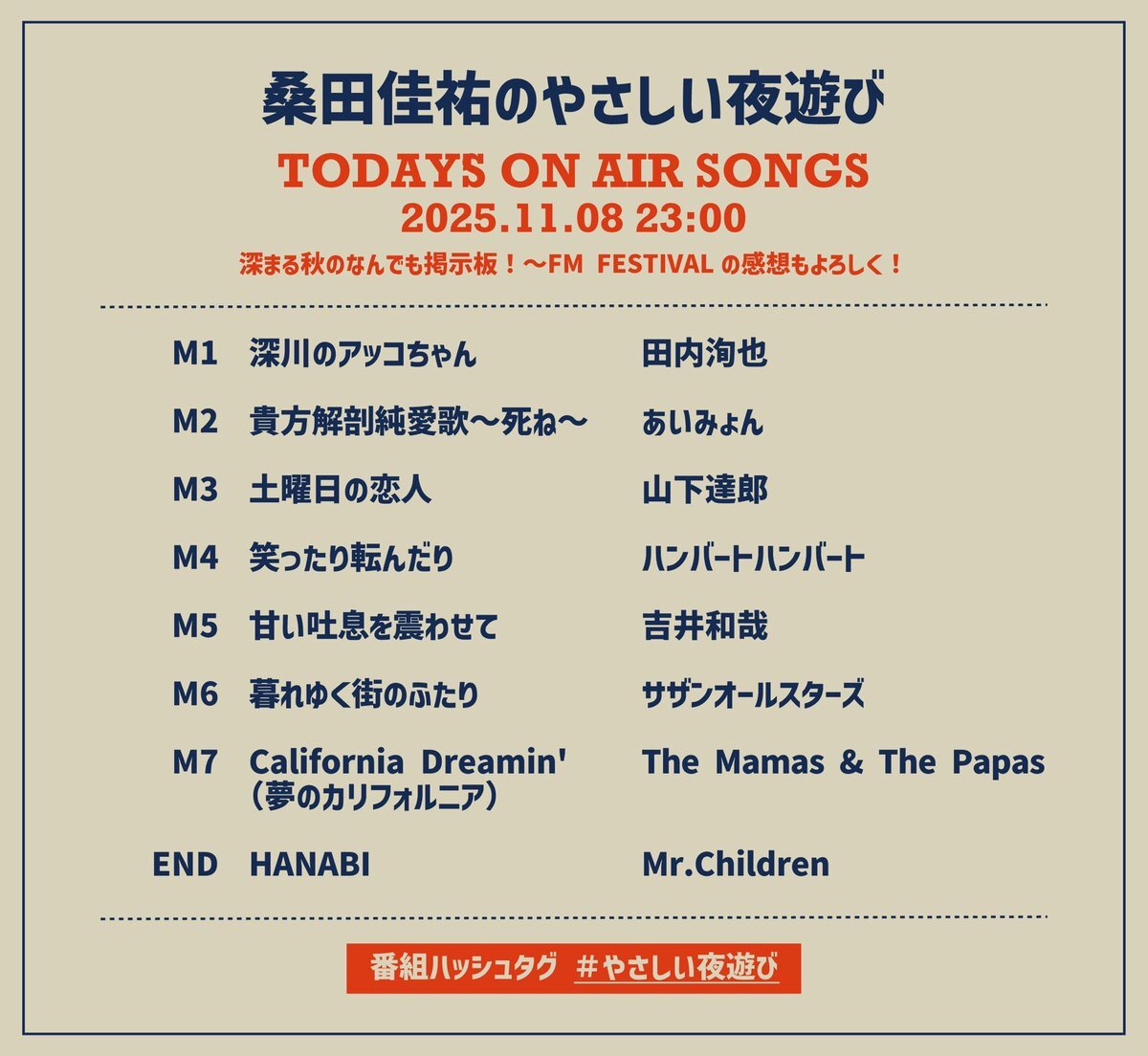 #桑田佳祐 の #やさしい夜遊び🌃🎶 今週は生放送でお届けしました☺️ 近況のエピソードや #九段下フォークフェス25 の裏話もたっぷりお話しました✌️ お聴きいただきました皆様ありがとうございました!✨ 来週は「深まる秋のなんでも掲示板!パート2」をお届けします🍂 お楽しみに💫