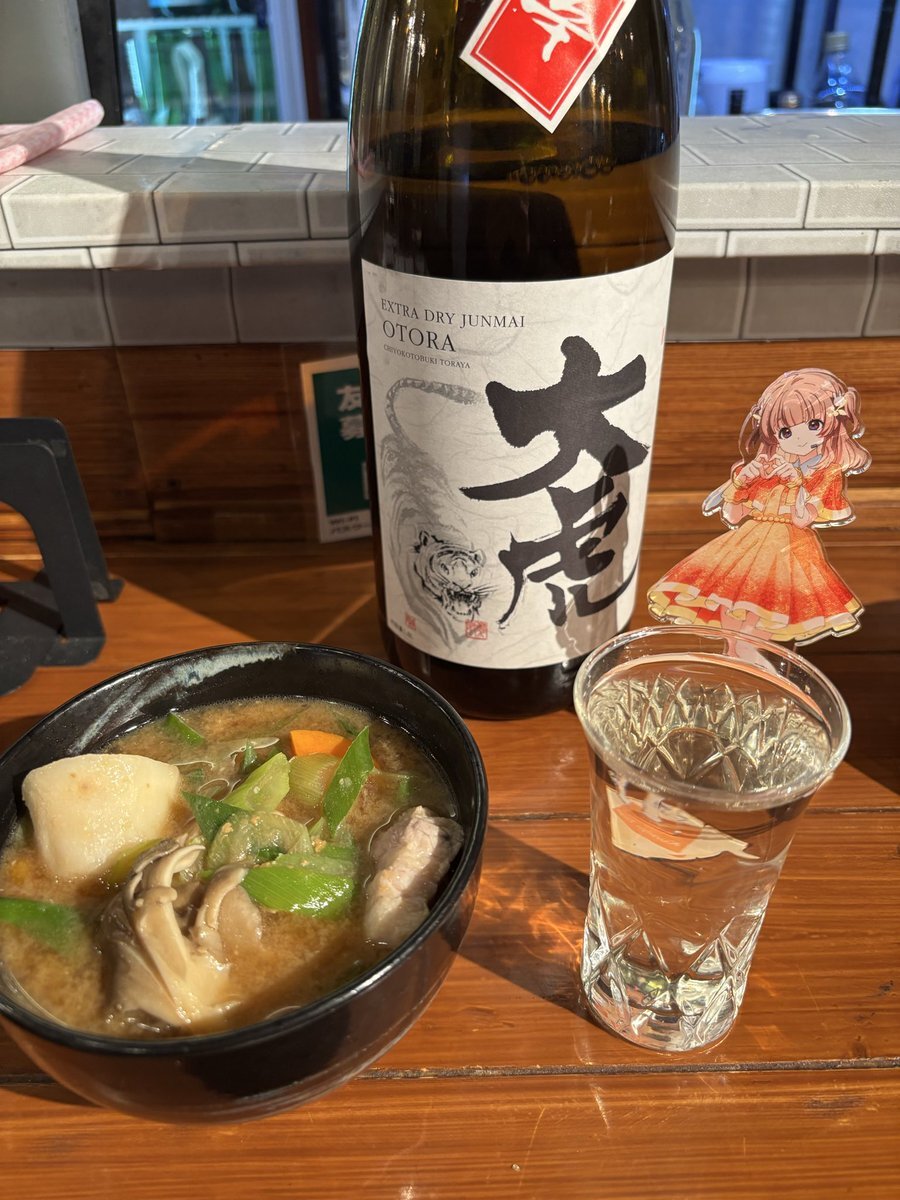 🍶千代寿 大虎 大辛口 純米🌾 山形県寒河江市『#千代寿虎屋』の純米酒 硬水で知られる月山の雪解け水で仕上げられた銘酒 まるでダシ汁の如き旨みと柚子のフレッシュさ、いつまで呑み飽きない辛口 🍴庄内風芋煮 平牧三元豚入り 味噌味🍠 #千代寿大虎 #サケペジウム #トラペジウム🌌 #日本酒 x.com/rccdogt3tgjtqe…