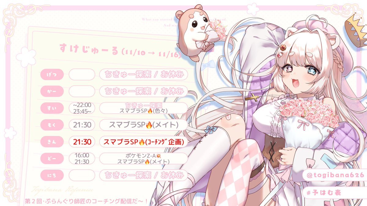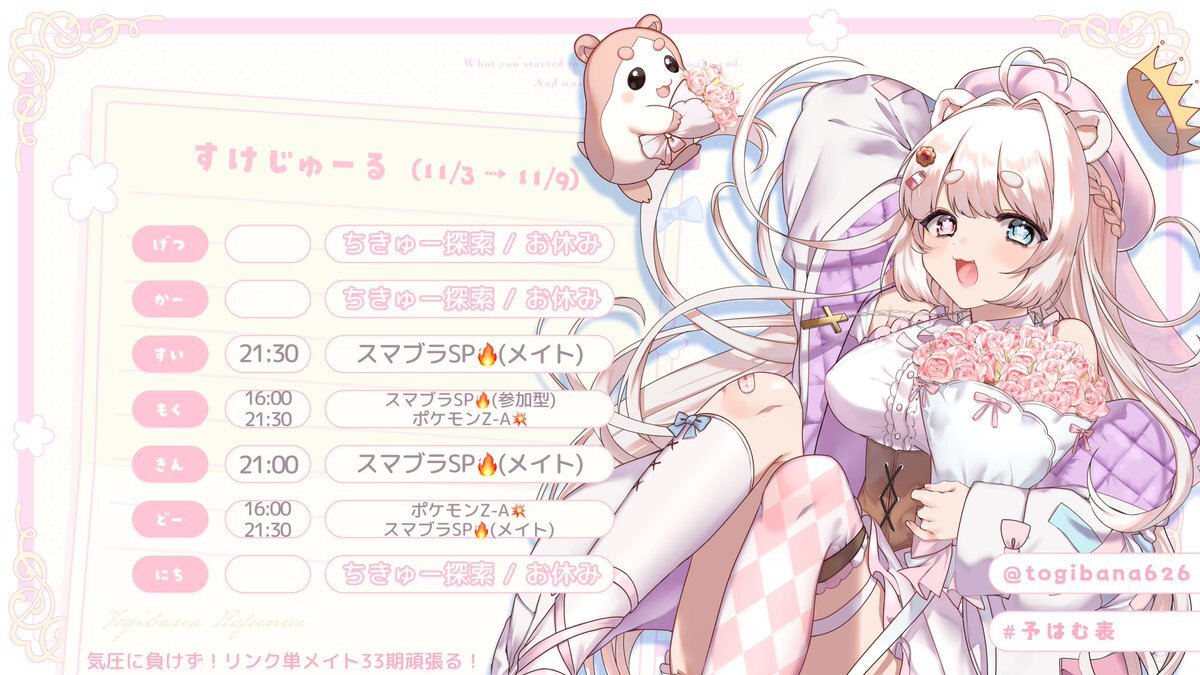 ╭━━━━━━━╮ 🗓️#予はむ表✍️ ╰━v━━━━━╯  ˚ʚ🐹ɞ˚ 大好きな“あなた”への招待状💌✨ いよいよスマメイト33期に挑戦だッ💪️🔥 木曜日は #ポケモンレジェンズZA 進めるよ🫶🏻💕 今週も何でもない日のぱーてぃーを一緒に楽ちもうね🫖🐁🎩 #スマブラSP #個人勢Vtuber pic.x.com/OWrbuveLe1
