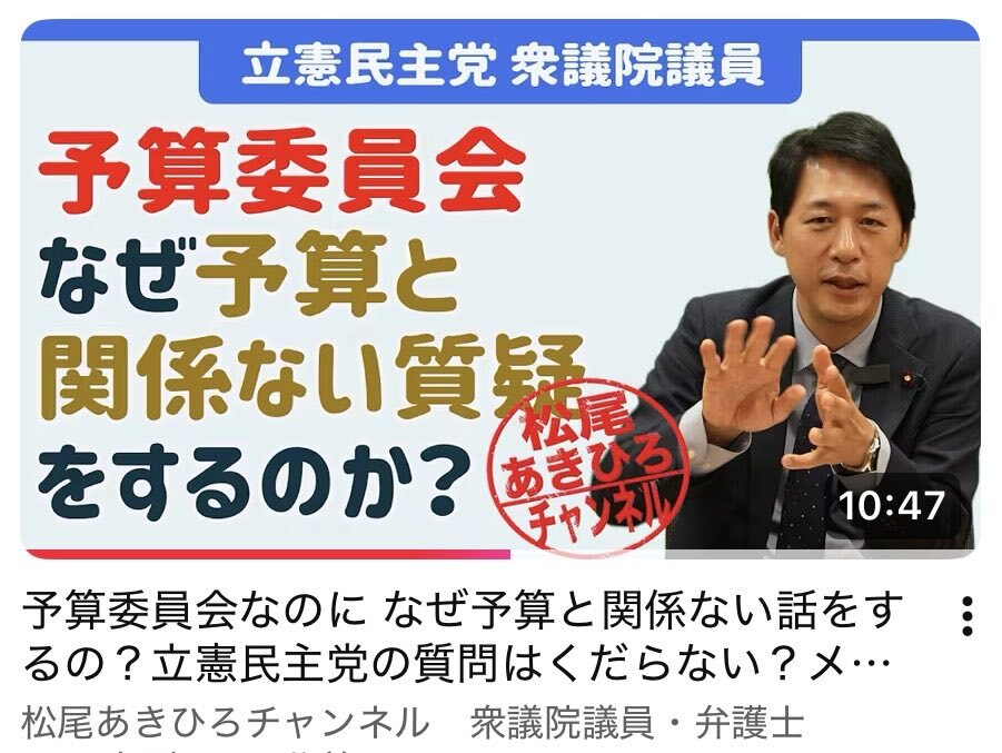 衆院立憲民主党松尾あきひろ議員のYou Tubeチャンネル「予算委員会なぜ予算と関係ない質疑をするのか?」を拝見しました。予算委員会の在り方や慣例を改革する必要があると思います。例えば、「党首討論」にするとか…。 #予算委員会 #慣例 #改革 pic.x.com/A9rP6DhWYK