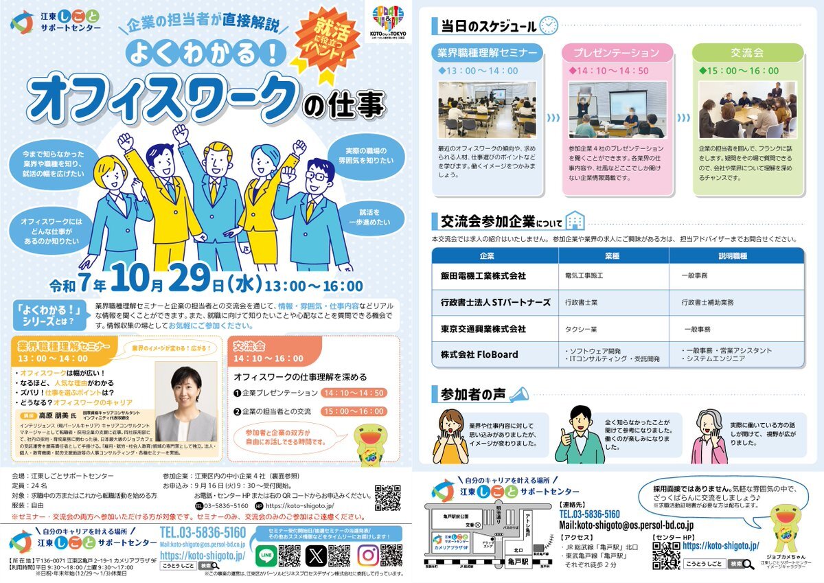 10月も終わりに近づき、ひと雨ごとに寒くなってきましたね。 10/29(水)【よくわかる!オフィスワークの仕事】が開催✨企業の担当者と直接お話しできる機会です。仕事内容や社風など気になることを聞いてみませんか?参加をお待ちしております! koto-shigoto.jp/yokuwakaru_1029 #仕事探し #事務の仕事 #江東区 pic.x.com/91reLwCCRr