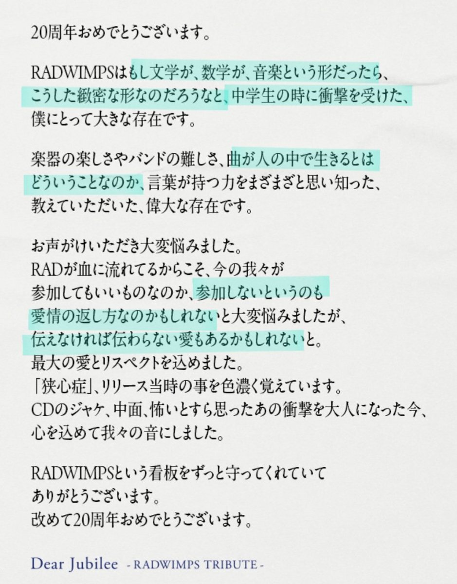 ■━━━━━━━━━━━■ Dear Jubilee -RADWIMPS TRIBUTE- 参加アーティスト&楽曲 第10弾発表!メッセージ到着! ■━━━━━━━━━━━■ [Dear Jubilee -RADWIMPS TRIBUTE-] 10th participating artist & song reveal! #MrsGREENAPPLE #狭心症 sp.universal-music.co.jp/radwimps/20th/… #RADWIMPS