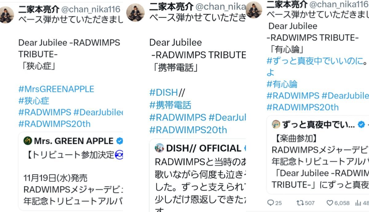 そっか!DISH//ってベーシストいないから とはいえまさか1枚のトリビュートアルバムで2曲以上参加されるとは笑 (ここまできたら9曲目のベースも二家本さんが弾いてるんじゃないかと予想しとく笑) #二家本亮介 #RADWIMPS #DearJubilee x.com/chan_nika116/s…