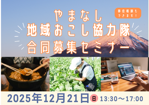 12/21やまなし地域おこし協力隊合同募集セミナー 地域おこし協力隊の募集を行う5自治体と、協力隊経験者が東京・有楽町に集結! 移住相談を希望する方の参加も大歓迎です! #移住 #地域おこし協力隊 #やまなし #山梨県 #二拠点 pref.yamanashi.jp/iju/event-news… pic.x.com/T45wVu3LiS