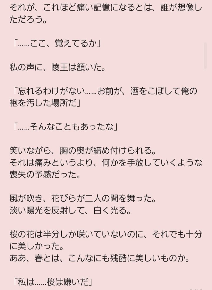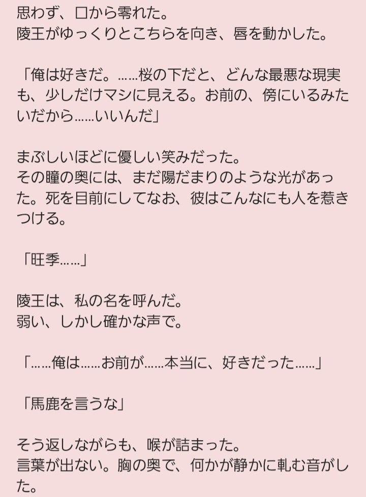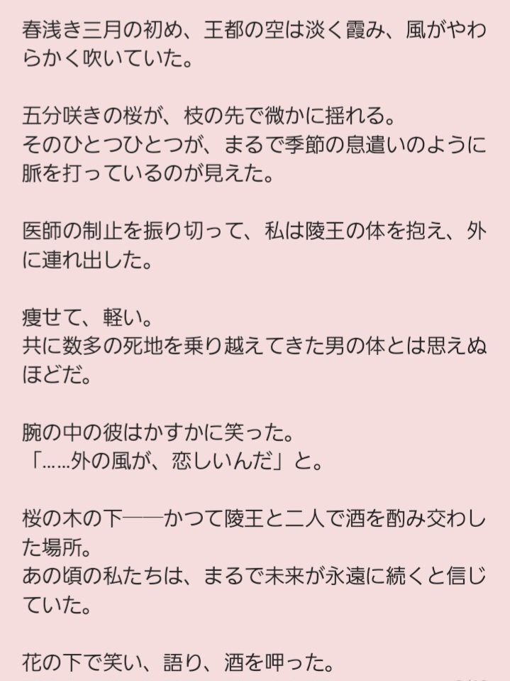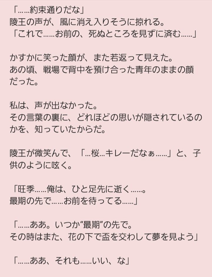 友人からのリクエストがあったので書いてみた短いお話『花守の約(旺季視点)』。 うん、原作小説の中に旺季様が陵王様を看取る描写があったような気がするけど、まさか二次創作で書く事になるとは思わなかったよ! #彩雲国物語 #二次創作小説 pic.x.com/yiz7tPsiYP
