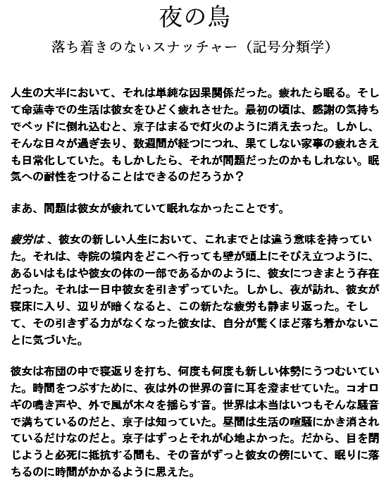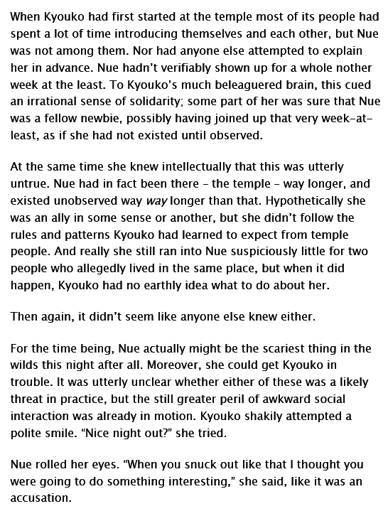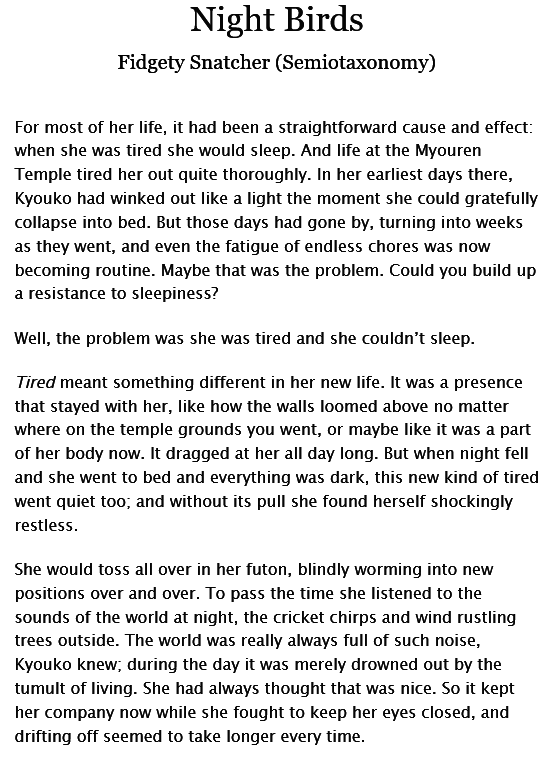Night Birds 夜の鳥 archiveofourown.org/works/43359726 (⬆️URL) #AO3 #二次創作小説 #東方project #東方 #touhou Fidgety Snatcherさん 命蓮寺の一員になって間もない頃 #幽谷響子 は疲れかストレスか、眠れない夜を過ごすうちに外へさまよい出る ぬえ&みすちーとの初邂逅 SS⬇️原文&自動翻訳サンプル pic.x.com/t0U10lDlqh