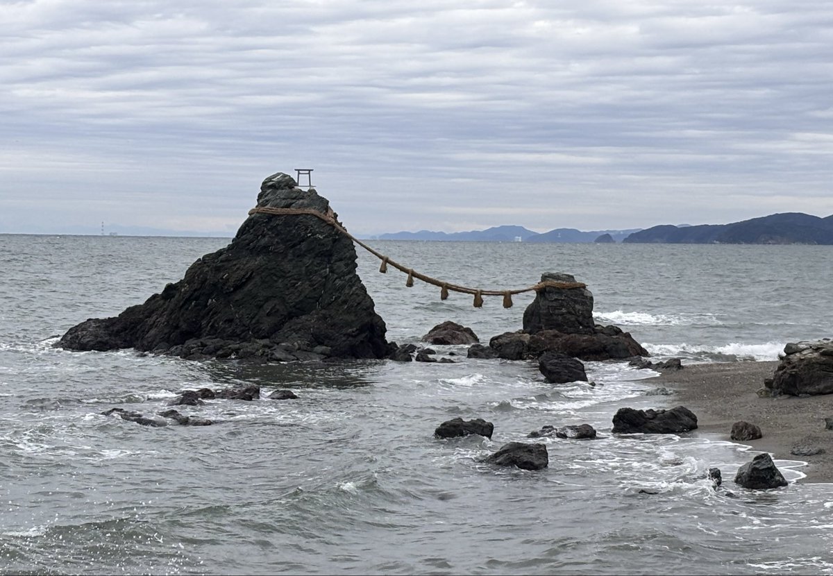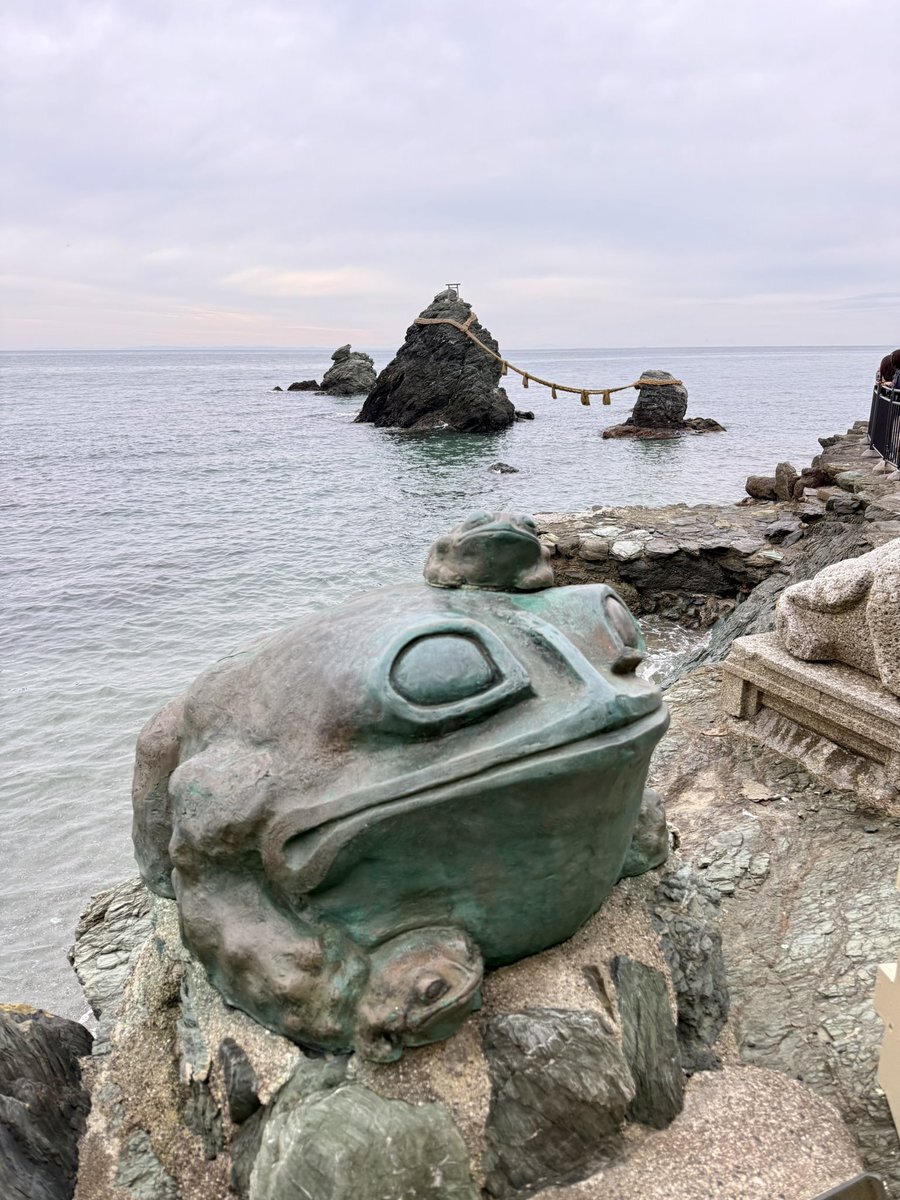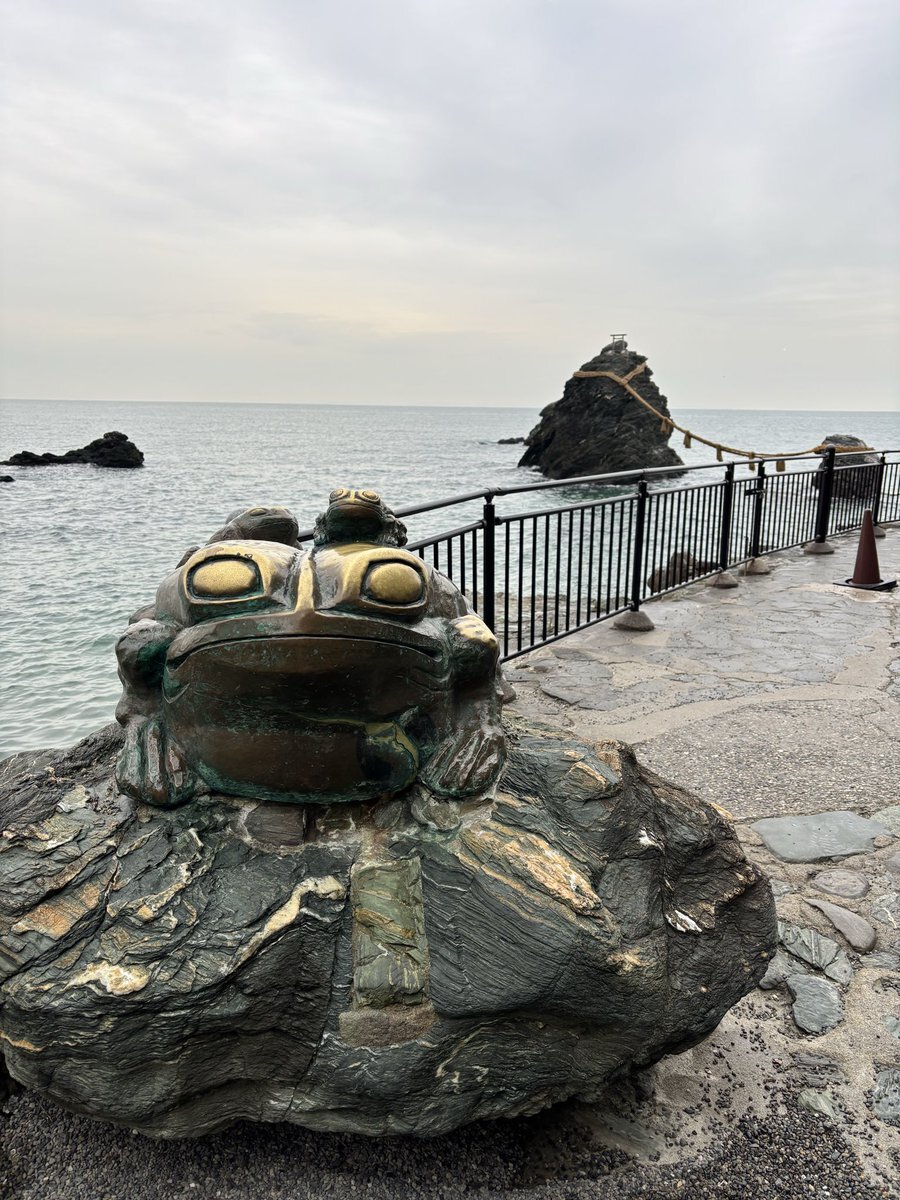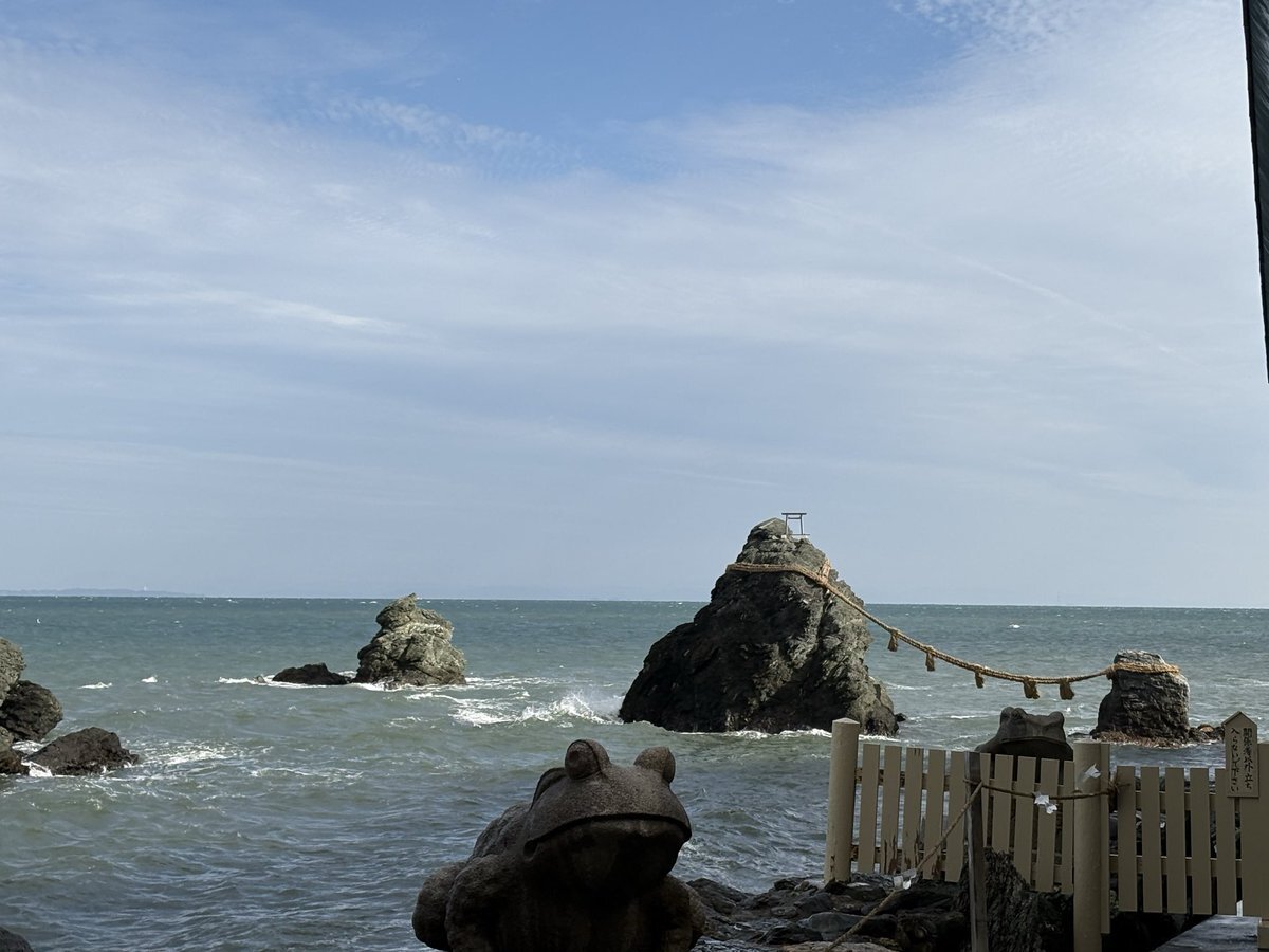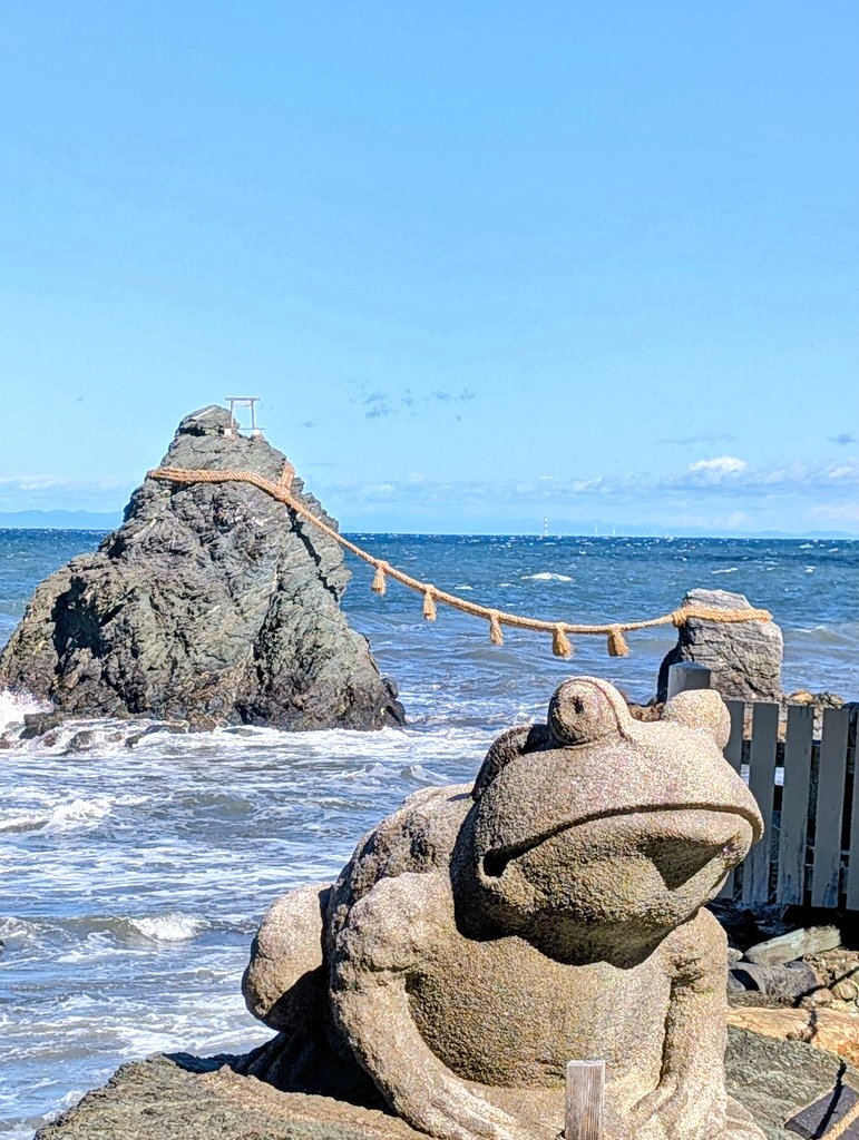 伊勢の二見興玉神社⛩🐸 夫婦仲良く末永く幸せに過ごせるようにお祈りしました✨ 夫婦岩🪨♡ 今日の伊勢の海は風が強かった🌀 #二見興玉神社 #夫婦岩 #ヌシとおでかけ pic.x.com/eIEwT0joXB