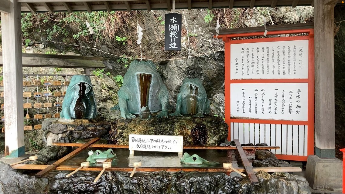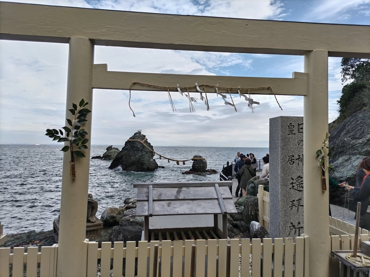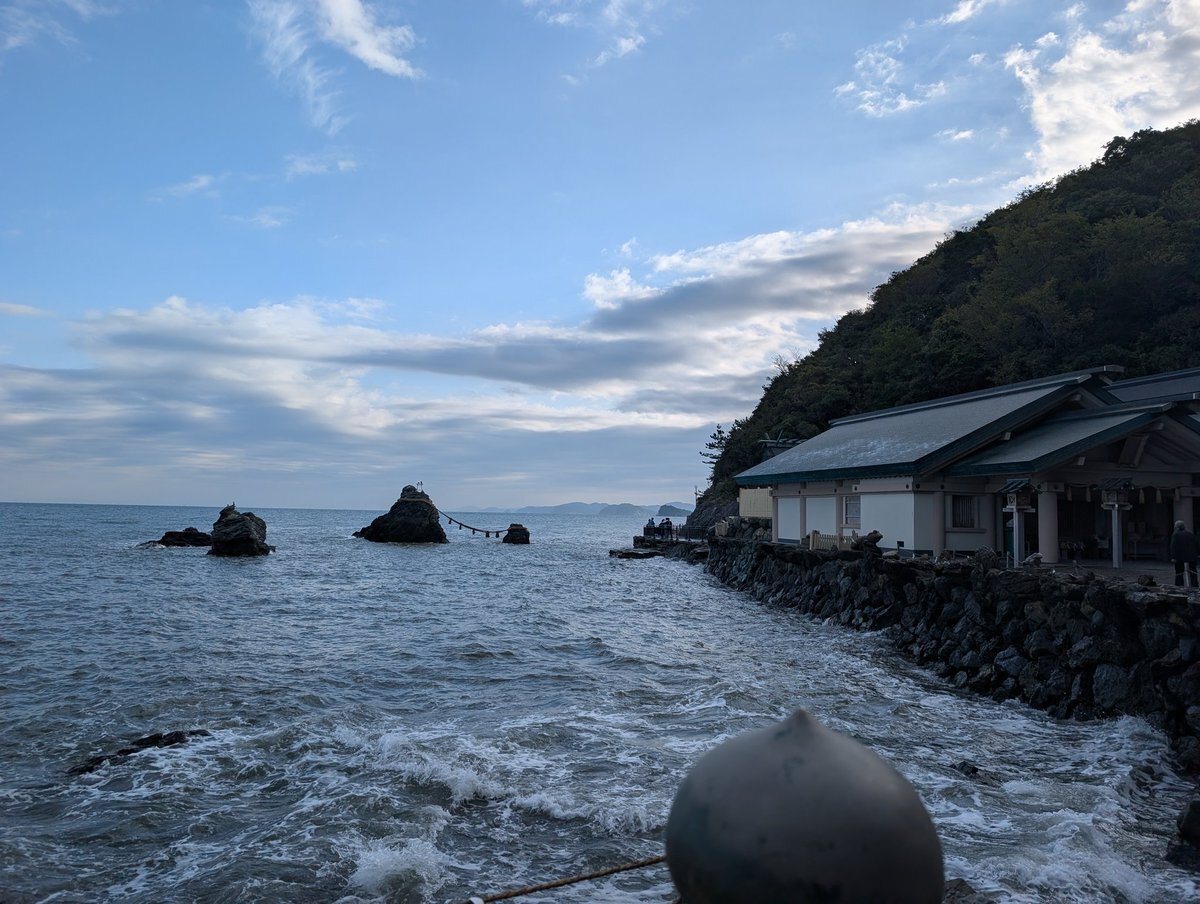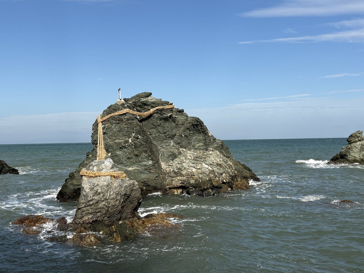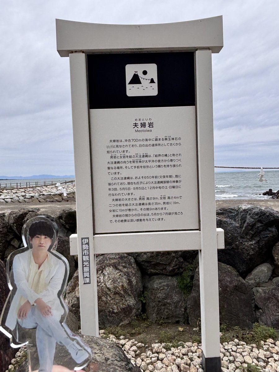 伊勢の二見興玉神社⛩🐸 夫婦仲良く末永く幸せに過ごせるようにお祈りしました✨ 夫婦岩🪨♡ 今日の伊勢の海は風が強かった🌀 #二見興玉神社 #夫婦岩 #ヌシとおでかけ pic.x.com/eIEwT0joXB