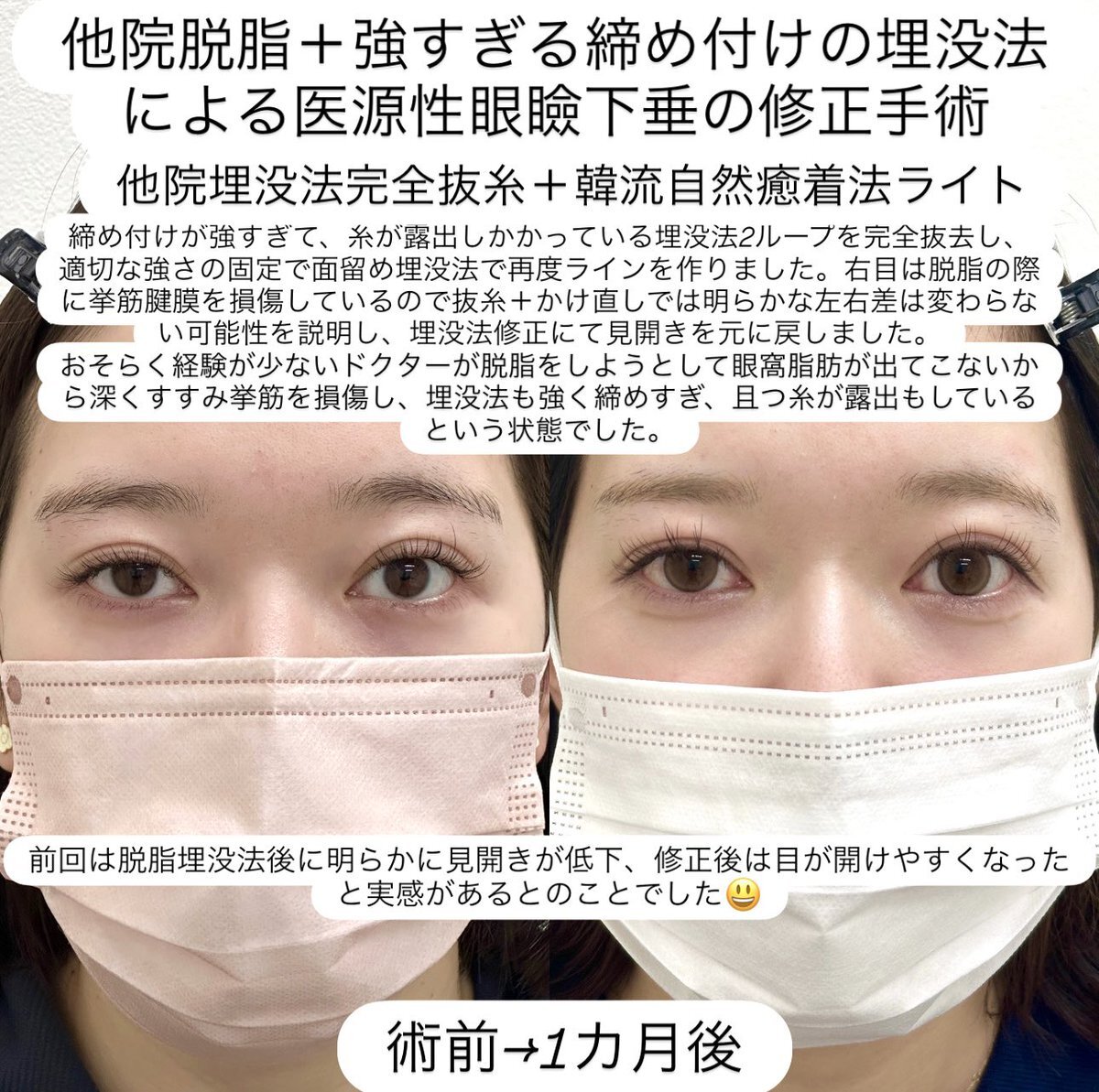 埋没法の糸の締め付けが強すぎると、それだけで見開きは低下してしまいます。 また、脱脂も不適切な操作で挙筋腱膜を傷つけ眼瞼下垂となってしまいます。 今回は強すぎる締め付け、かつ露出している埋没糸を抜糸して適切な強さで再度埋没しました。 #眼瞼下垂 #二重修正 #埋没法抜糸 pic.x.com/TEnDK5XvVC