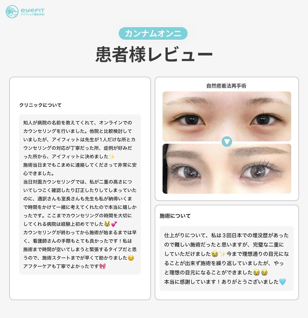 アイフィット患者様レビュー✨ ✔自然癒着法再手術+目頭切開術 カンナムオンニではリアル術後経過+レビューをご覧いただけます😊 オンラインカウンセリングも可能ですのでお気軽にお問い合わせください🎀 お問い合わせ:lin.ee/GpVUDIZ #韓国整形 #渡韓カウセ #二重修正 #目頭切開 #埋没 pic.x.com/IfF2EintoN
