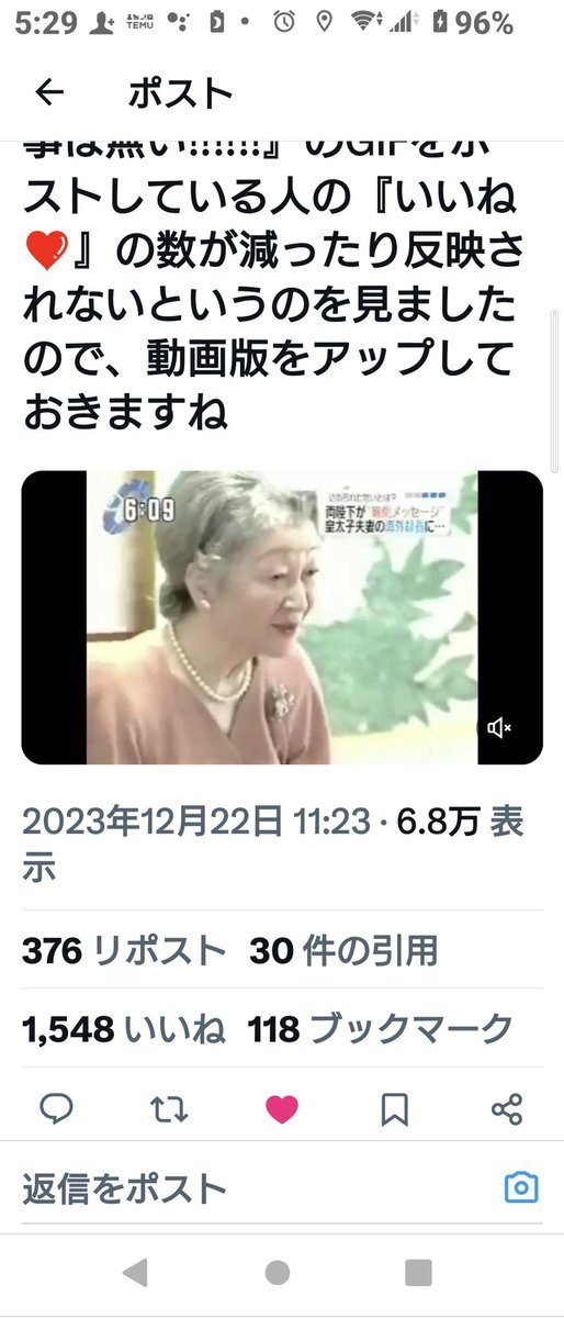 返信先:@2020tamagoyaki12月29日5:30時点の リポスト 376 いいね 1548 #上皇上皇后 #雅子皇后への虐め #二重権威 誰の差し金なのか、リポストやいいねが消される怪現象。 pic.x.com/uPcsMfQUcT