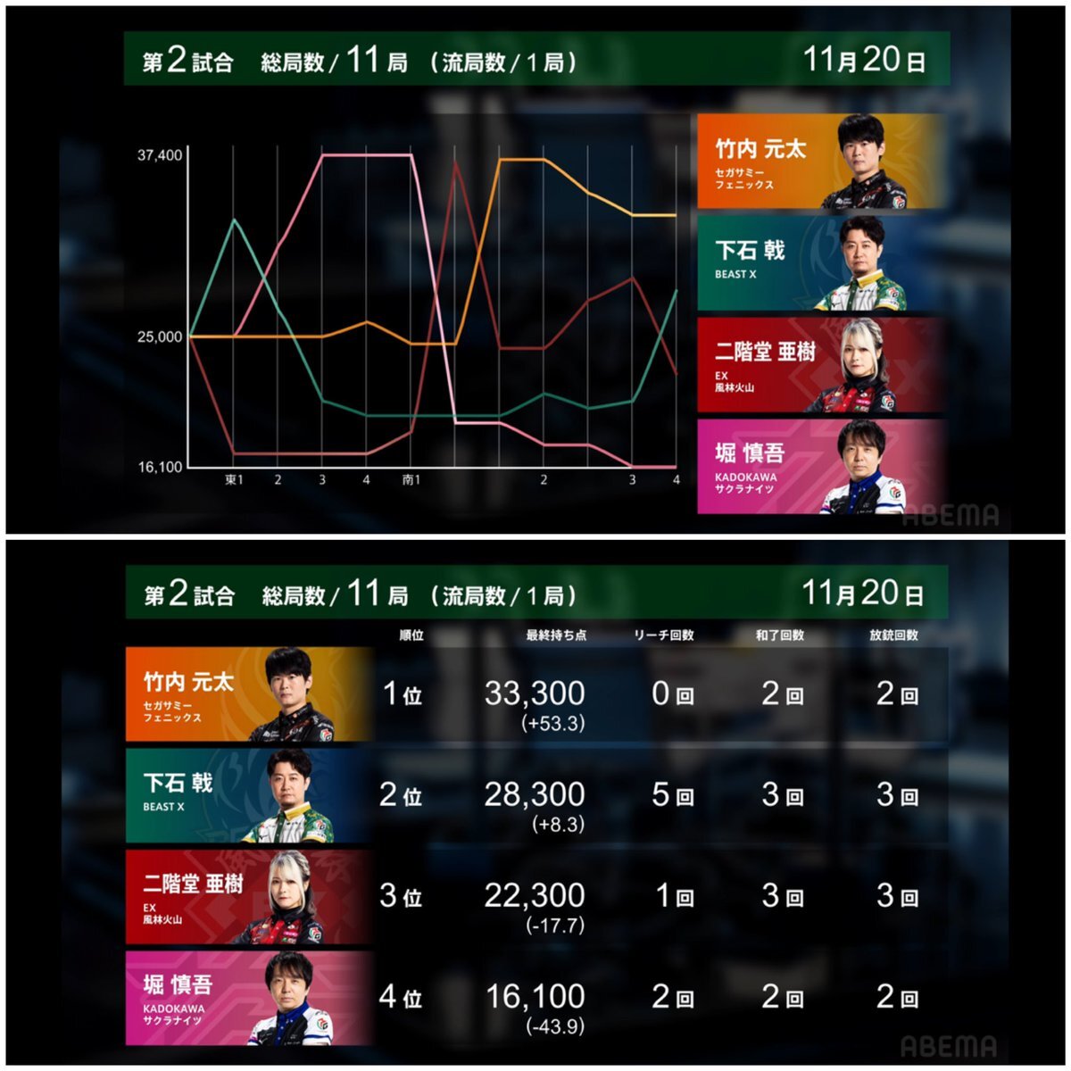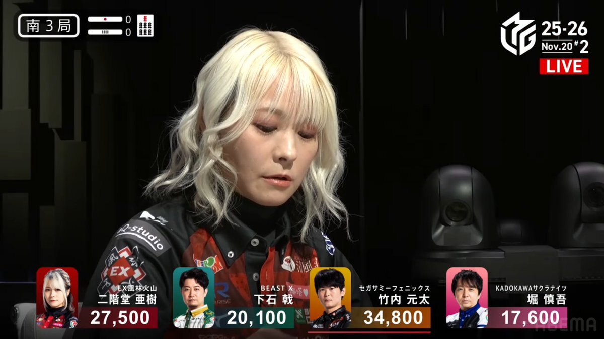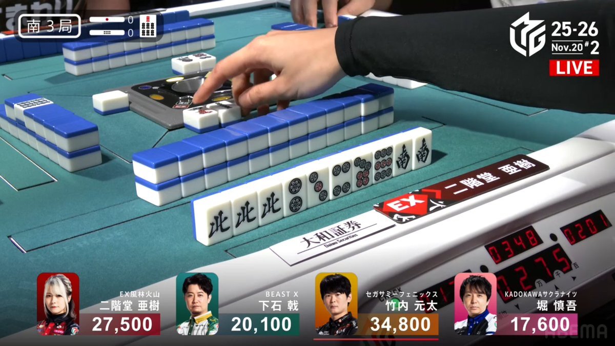 #Mリーグ 2526Day39W 2nd #BEASTX #下石戟 はここで初顔合わせの #KADOKAWAサクラナイツ #堀慎吾 に 放銃続くも最終的に2着 途中 #EX風林火山 #二階堂亜樹 がトップ目になるも今度は #セガサミーフェニックス #竹内元太 が追い抜いてトップとなり個人連勝 pic.x.com/9bo4DK9Vp3