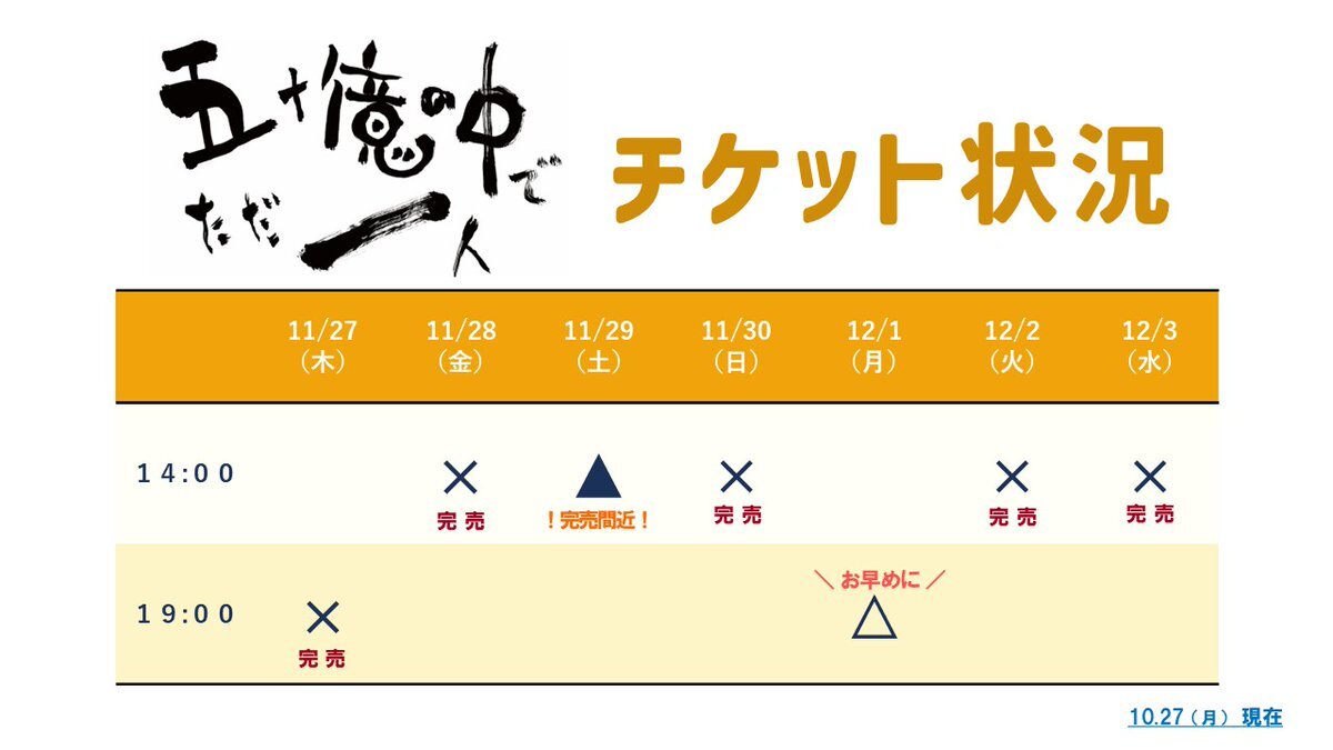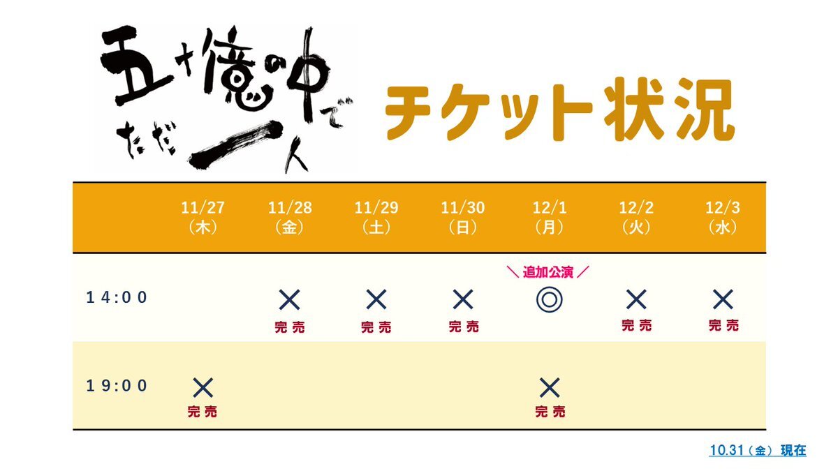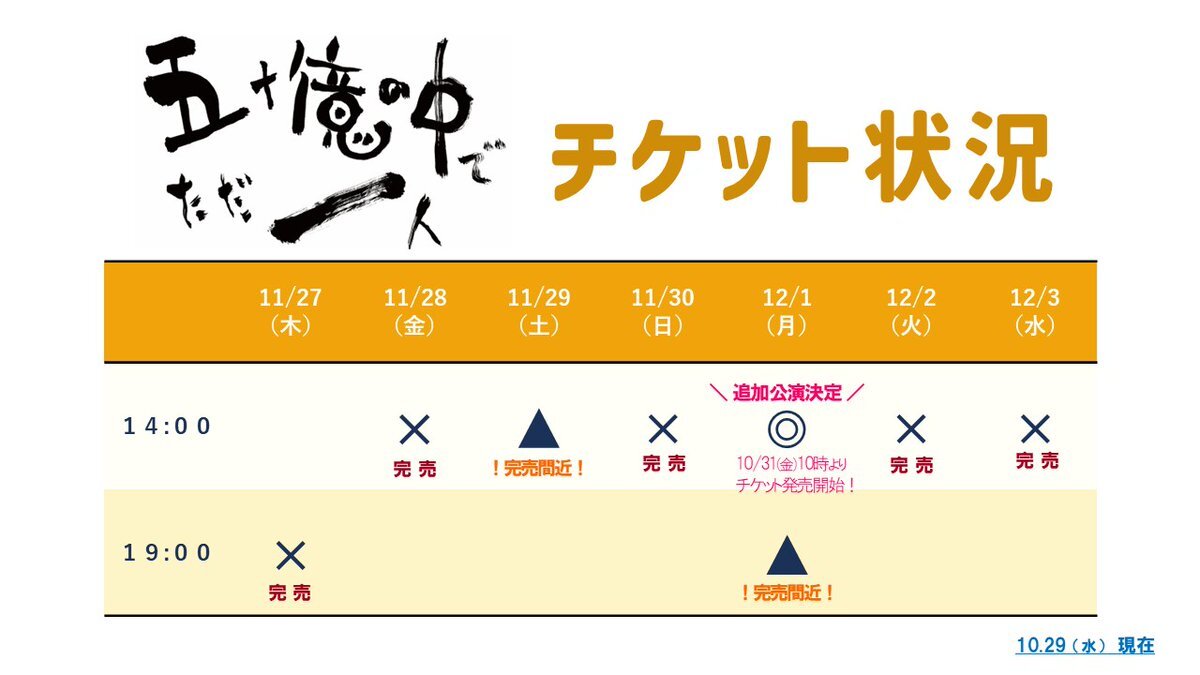 #五十億の中でただ一人 チケット状況📢 \ 11/29(土)14時も完売になりました! 沢山のご注文ありがとうございます🙇 現在受付中の公演は、12/1(月)19時の回です💁 こちらも残り僅かです…! 🎫追加公演のチケットは明日10時より発売開始です! pic.x.com/TNtFVSp7AF
