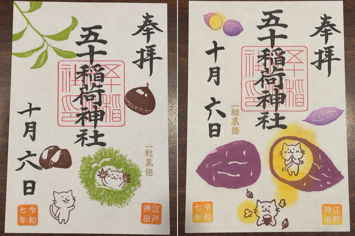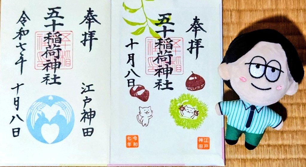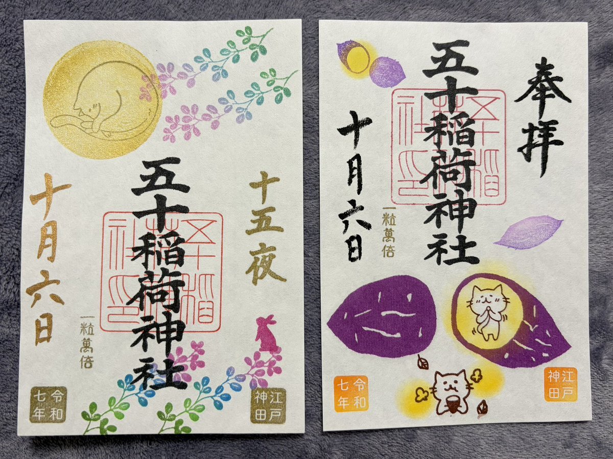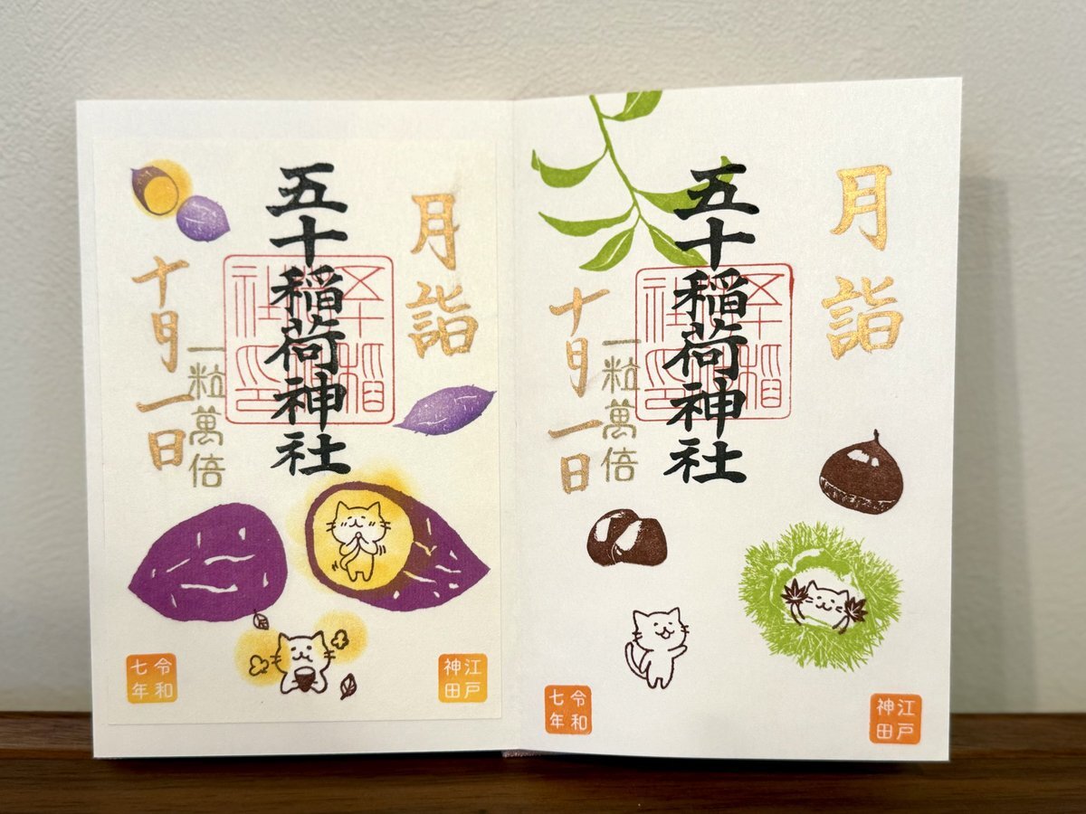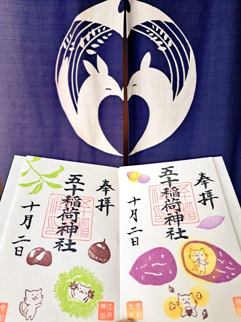 五十稲荷神社🦊⛩️🦊 誕生日詣③ おかげさま詣の日(2日)に参拝🙏✨ 新しいデザインの誕生日御朱印を頂けました😺🎁✨ 本日10月13日は推し活仲間の結婚式💒👰✨ この素晴らしい結婚式に御朱印でお祝いを! 秋らしいかわいい御朱印も頂きました🌰🍠🍁😸✨ #御朱印巡り #五十稲荷神社 pic.x.com/yMkovWAykB