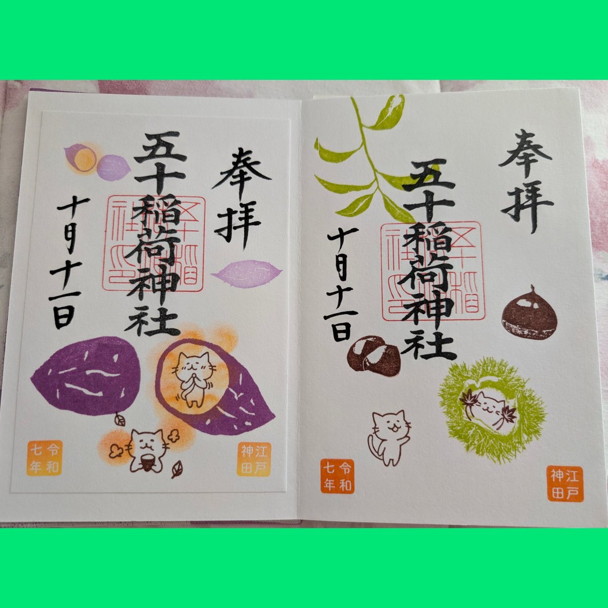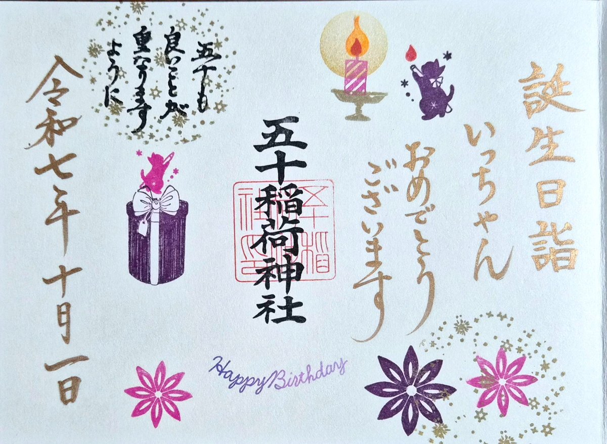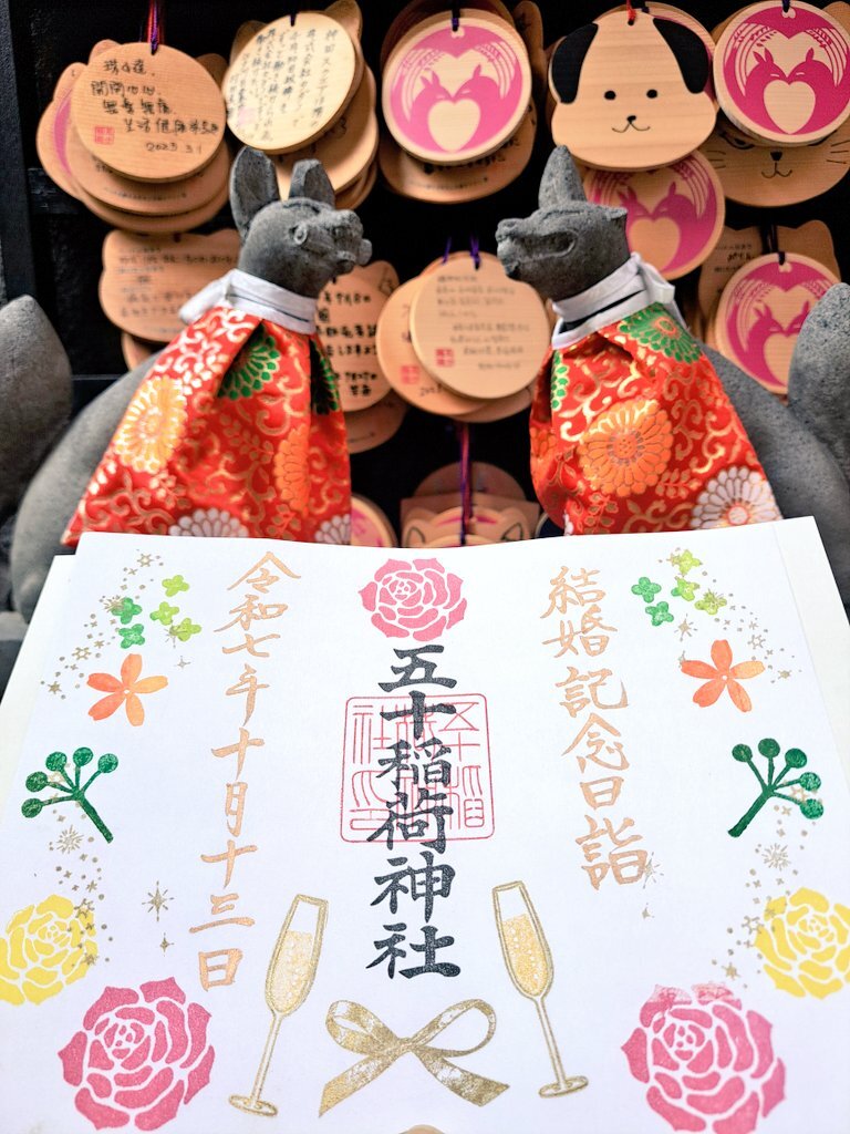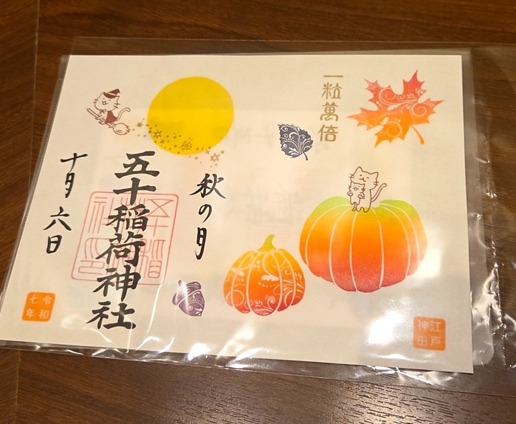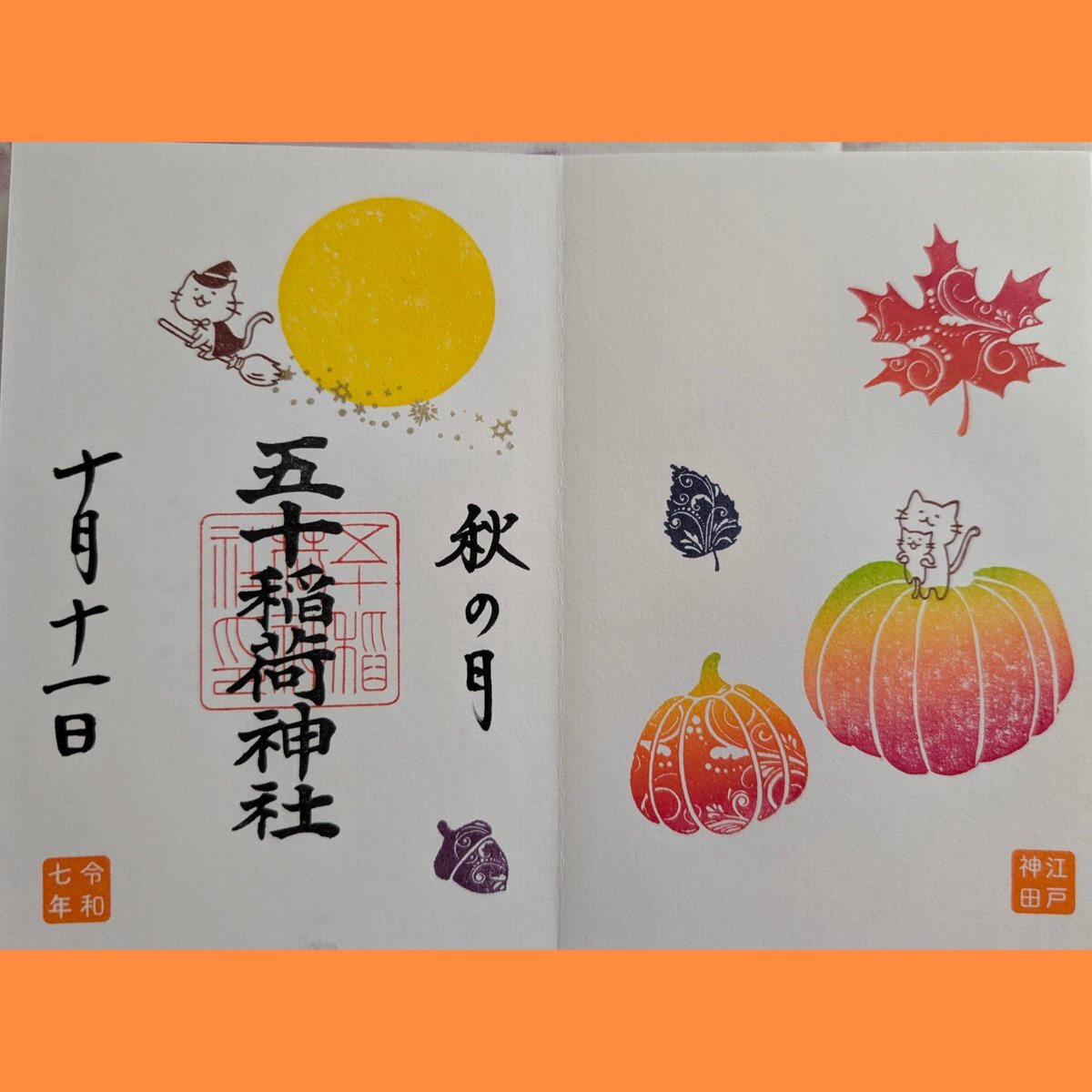 五十稲荷神社🦊⛩️🦊 誕生日詣③ おかげさま詣の日(2日)に参拝🙏✨ 新しいデザインの誕生日御朱印を頂けました😺🎁✨ 本日10月13日は推し活仲間の結婚式💒👰✨ この素晴らしい結婚式に御朱印でお祝いを! 秋らしいかわいい御朱印も頂きました🌰🍠🍁😸✨ #御朱印巡り #五十稲荷神社 pic.x.com/yMkovWAykB