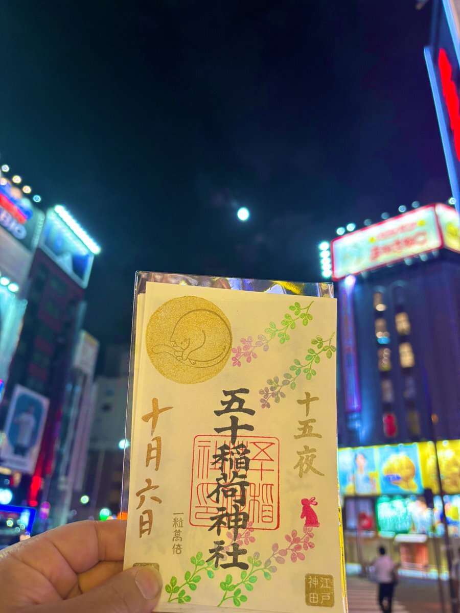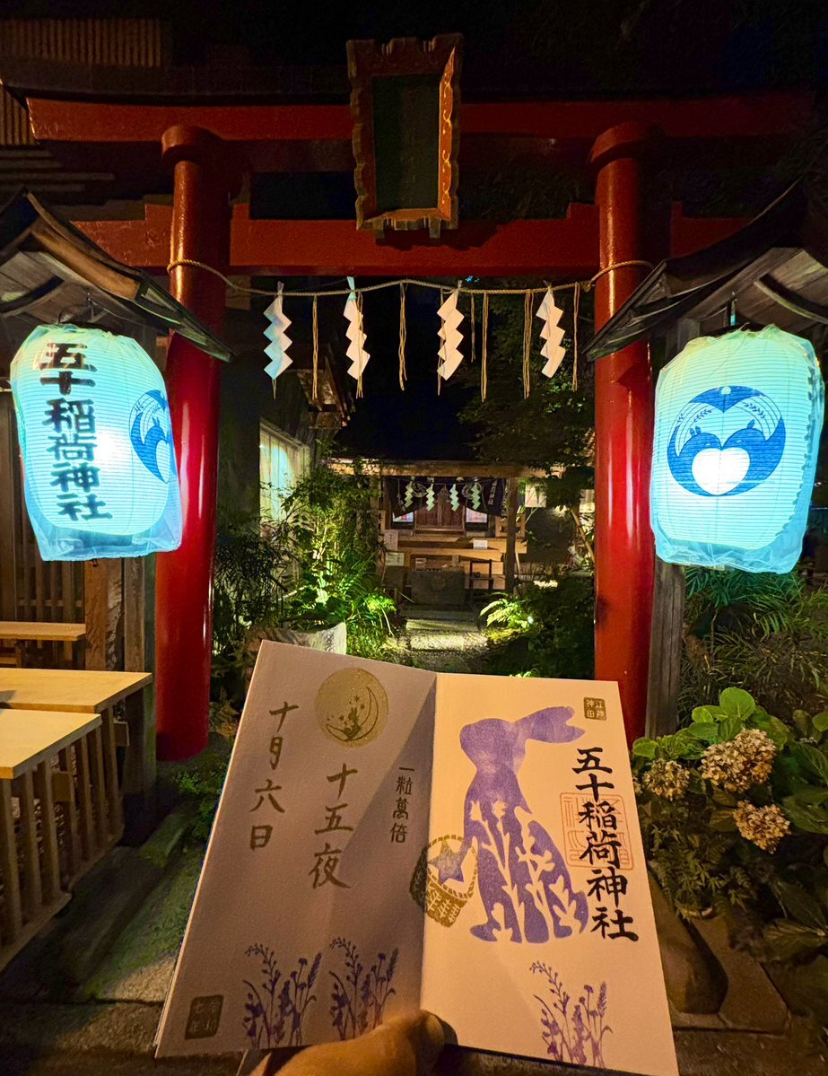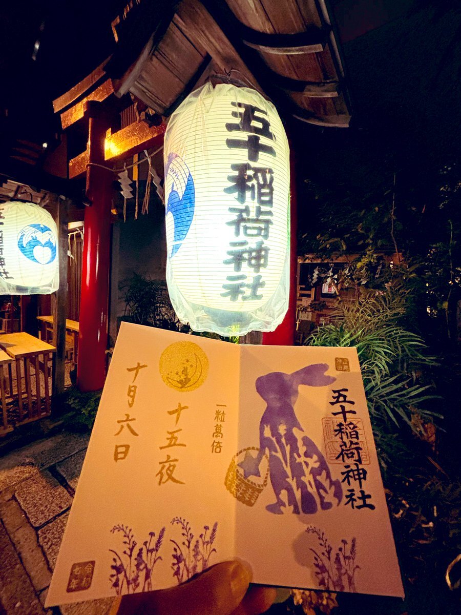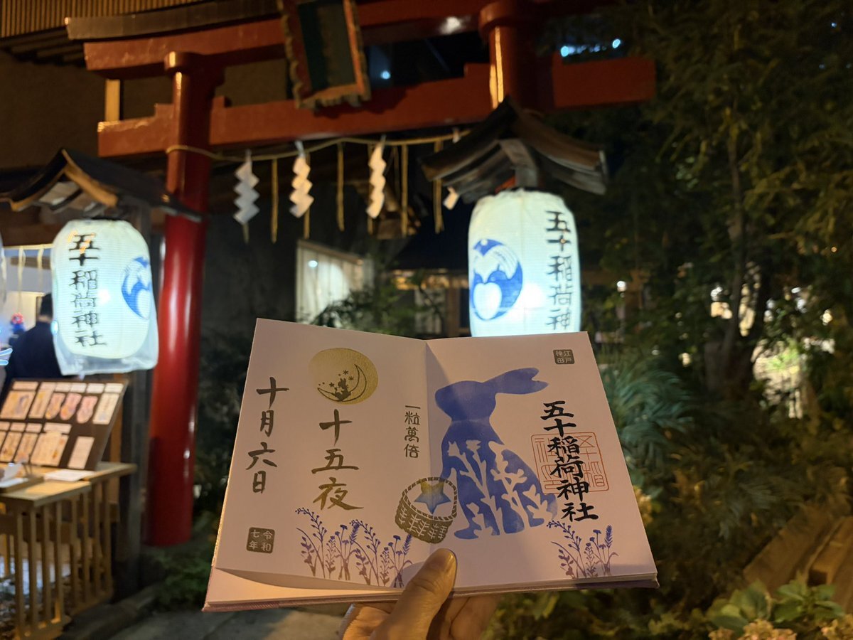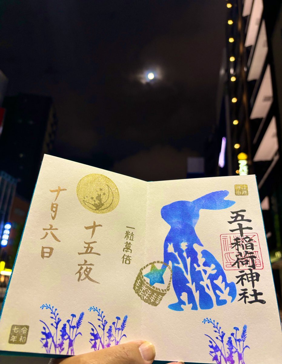 2025年10月6日 中秋の名月🎑 五十稲荷神社⛩️さんの御朱印の受付が19時までとの事だったので仕事終わってから参拝させていただきました👏 十五夜の書置き御朱印と見開きの御朱印をお書き入れしてもらいました🖌️ 帰り道にお月様といただいた御朱印とパシャリ🌕🐇📷 #神社 #御朱印 #五十稲荷神社 pic.x.com/az9OBbPioT