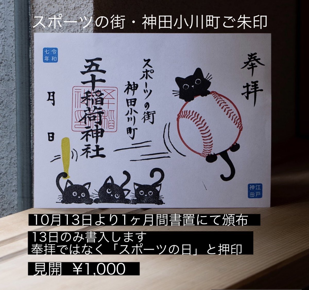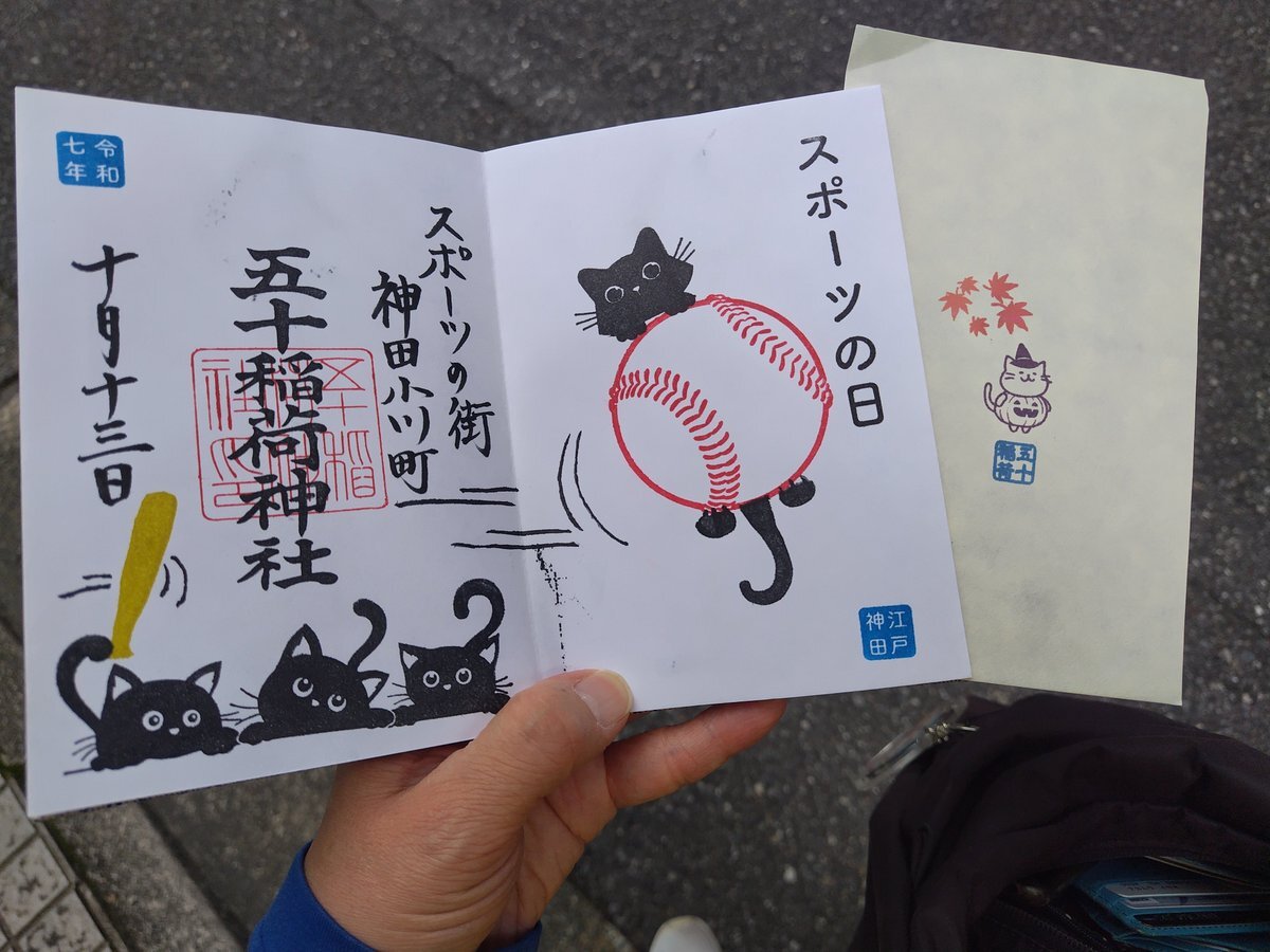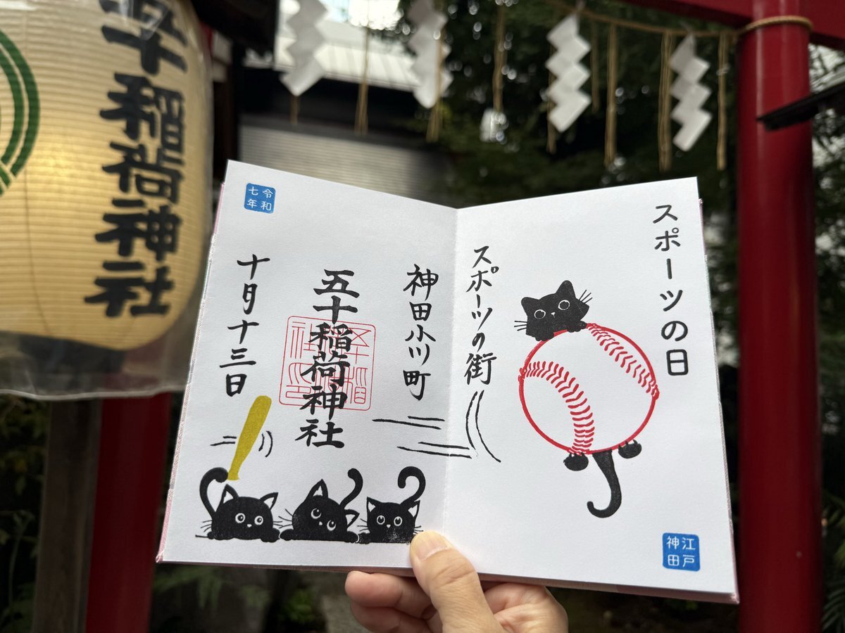 10月13日のスポーツの日より「スポーツの街神田小川町ご朱印」を頒布します 10月13日のみ書入でその後1ヶ月間 書置にて頒布予定です 書入に関しては別のポストにて詳しくご案内していますので必ずご確認のうえお越しください #五十稲荷神社 の鎮座する神田小川町は 世界でも有数のスポーツ用品店街 pic.x.com/WBBc5c7KmZ