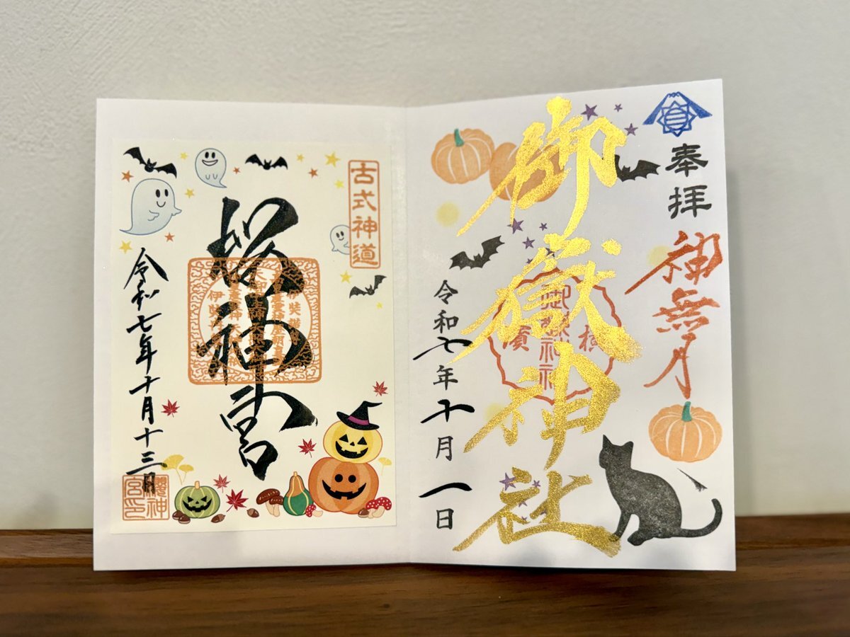 先日、うなちゃんから お願いしていた御朱印を 受け取りました😊 十五夜の書置きは プレゼントで頂きました🎁 ありがとう🥺 今月も五十さん可愛い🩷 桜神宮の御朱印は YUKIさんにお願いしました ハロウィン専用の御朱印帳、 なかなか進まない💦 #五十稲荷神社 #桜神宮 pic.x.com/CBUM9S88Vl