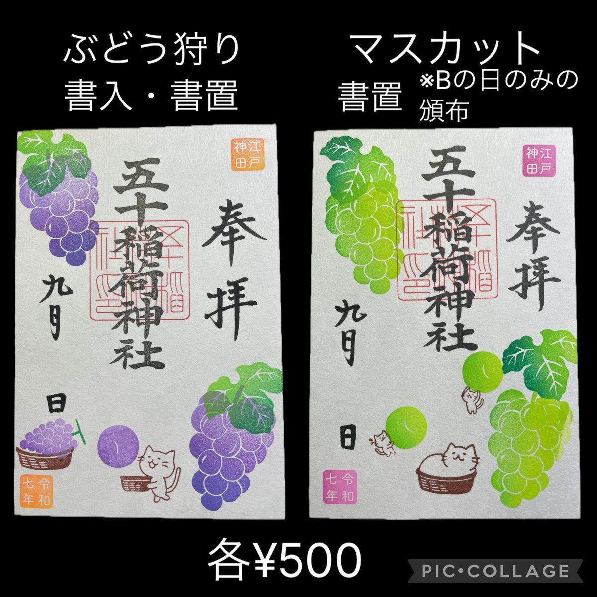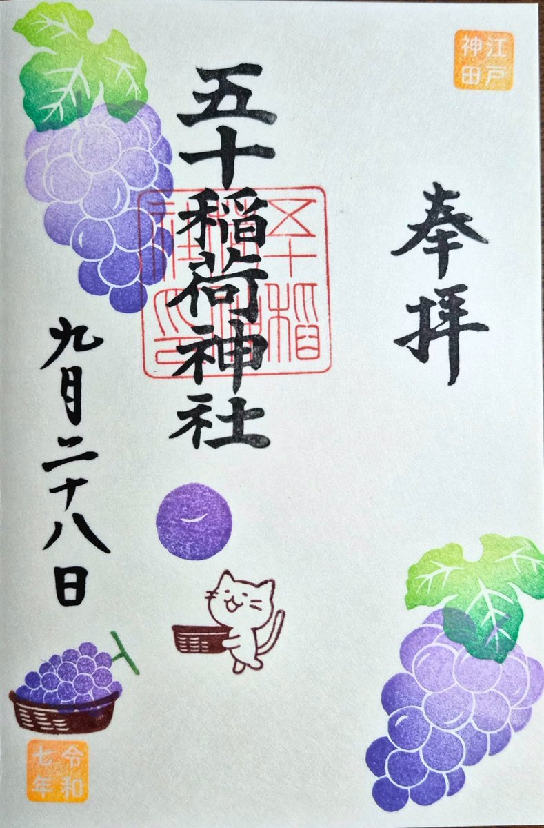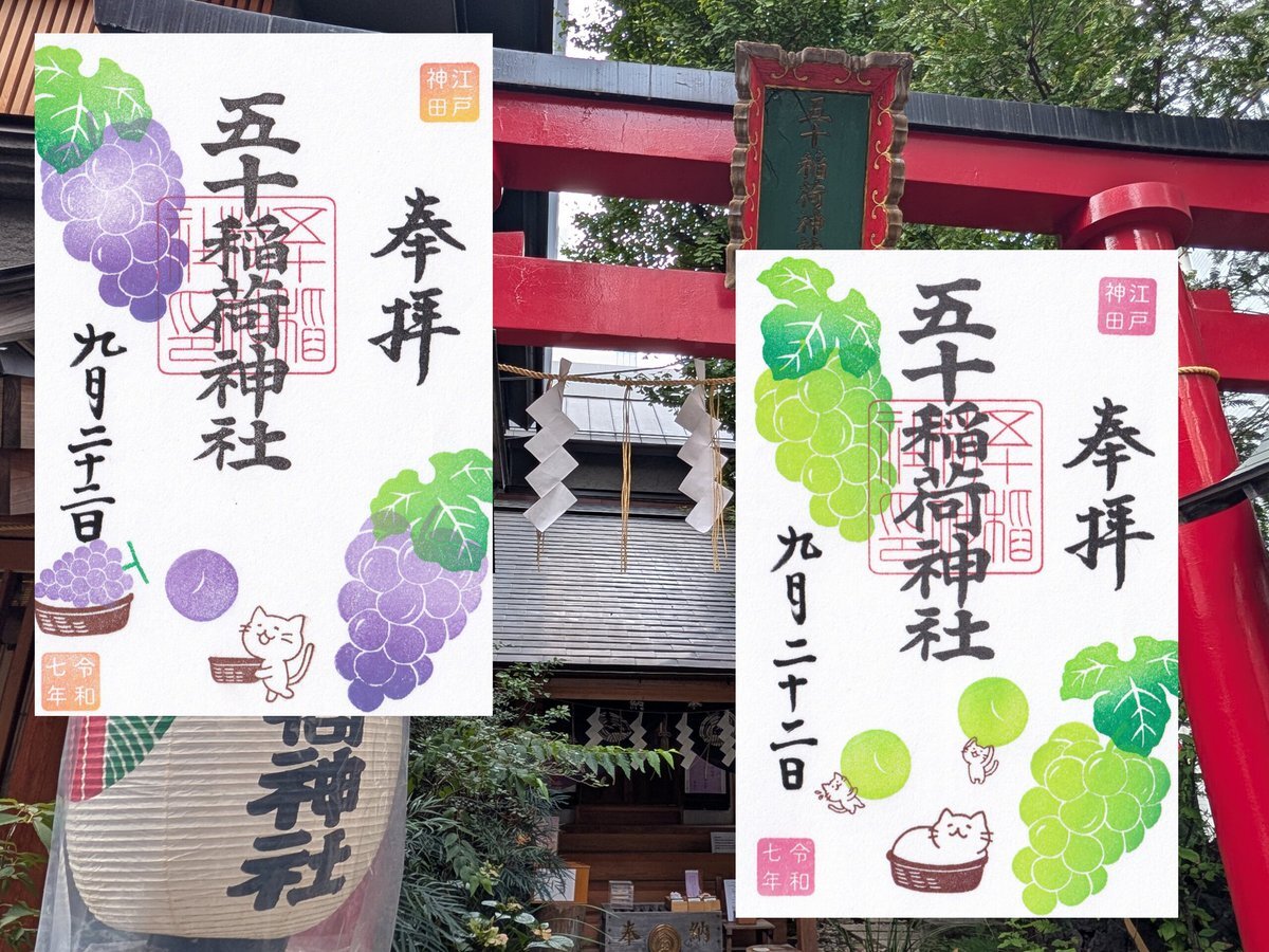 【#五十稲荷神社】2025.9.22⑤ なかなか書入れの日とタイミングが合わず書置きの日ですがお詣り。書置きの日のみのマスカットの御朱印も拝受。ブドウの御朱印にもある猫たちにはちゃんとストーリーがあるんですね(^^) #御朱印 #書置き #月詣り #千代田区神田小川町 pic.x.com/fc9fwWv5Or