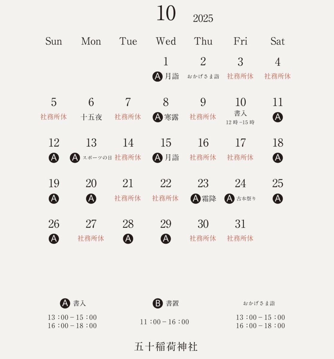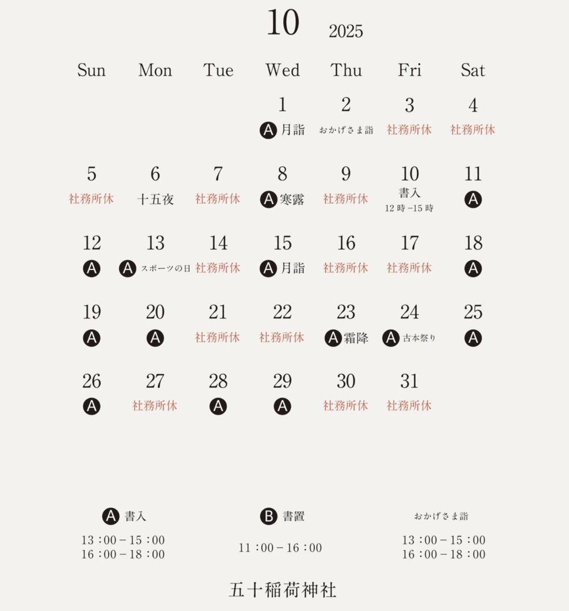 令和7年10月10日 本日の社務所開所とご朱印書入受付は ‼️pm12:00〜3:00です‼️ いつもの時間と違うのでご注意ください 本日の書入・書置はこちらです↓ #五十稲荷神社 pic.x.com/L41P3AhVqu
