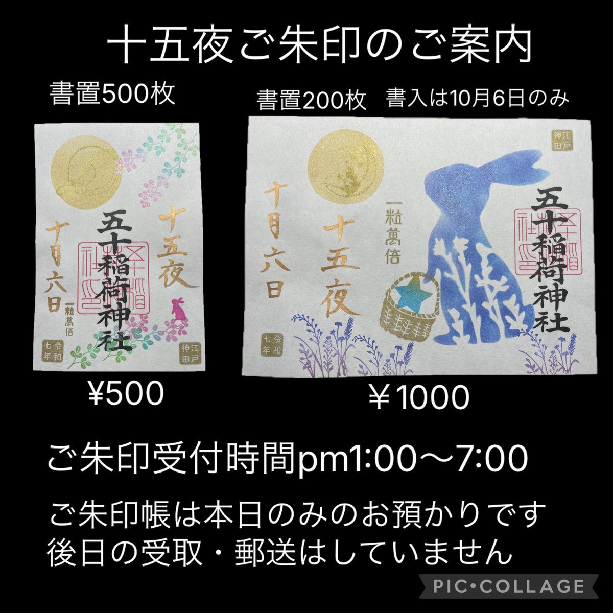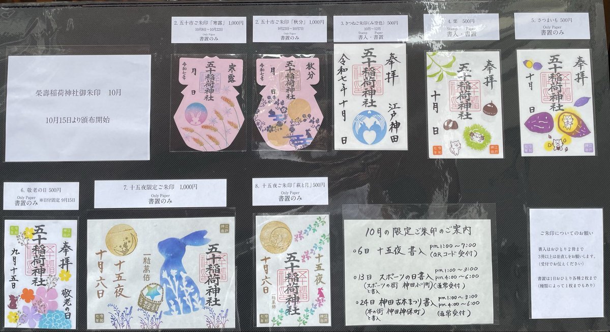 10月6日本日は十五夜🌕 ご朱印は十五夜ご朱印のみ書入 他の種類のご朱印は書置でのお渡しです 全ての方にQRコード受付ですので 書置は先のお渡しとなります (本日はお1人各1枚ずつ) 書置の残り枚数の確認のためいつもと違うお渡し方法ですがどうかご協力よろしくお願いします #五十稲荷神社 pic.x.com/VFwIu9GR9p