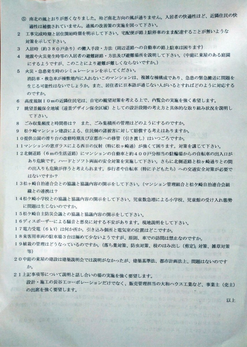 #救急車が入れない #11棟が1棟 #大和ハウス の送り火の街のマンション #プレミスト京都松ヶ崎(施工:長谷工) 京都市建築審査会が危険性を指摘したことなどを受け、懸念事項等に関する説明を事業者に要求した住民団体の「申入書」を公開! 事業者からは、未だ説明無し! #五山送り火のまちを守れ pic.x.com/TW1qeSyTnB x.com/sutekinanickna…