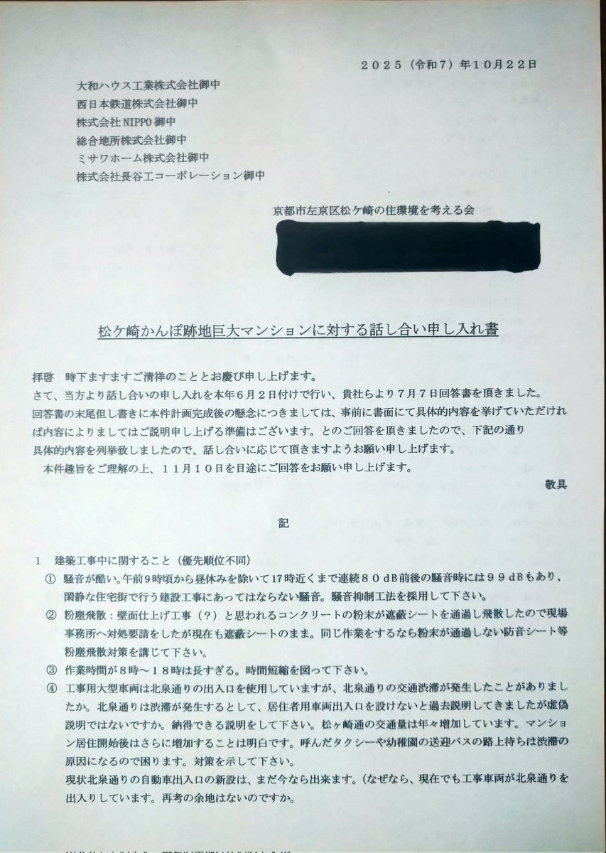 #救急車が入れない #大和ハウス の送り火の街のマンション #プレミスト京都松ヶ崎(施工:長谷工)   建築審査会が危険性を指摘し住民への説明を求めたのを受け、住民団体が事業者に説明会を要求した「申入書」、そして事業者からは未だ説明がないと訴える投稿! 皆の力で #五山送り火のまちを守れ pic.x.com/elIOUTHOqV x.com/XPC128945/stat…