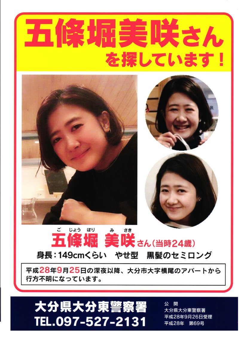 【平成28年9月26日受理、大分市大字横尾における行方不明事案】 大分市大字横尾のアパートから、五條堀美咲さんが行方不明になっています。似た人を見かけた方は、情報提供をお願いいたします。 大分東警察署(097-527-2131) #大分県警察 #五條堀美咲さん #大分東警察署 pic.x.com/egzCcRqyBF