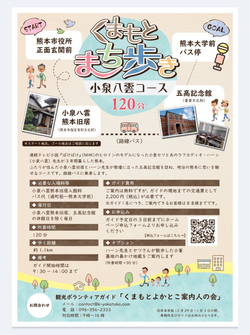 くまもとまち歩き「小泉八雲コース」 ヒロインのモデルになった小泉セツと夫のラフカディオ・ハーン(小泉八雲)が3年間暮らした熊本。 ふたりが住んだ小泉八雲旧居とハーン先生が教壇に立った五高記念館を訪ね、明治の熊本に思いを馳せるコースです。 k-yokatoko.com/machiaruki2025…
