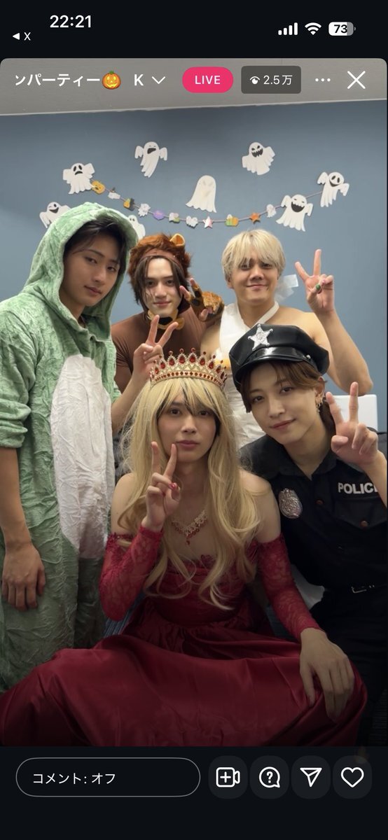 『 KEY TO LIT Arena Tour 2025 WAKE UP THE FOOL 』 ツアーファイナル直前インスタライブをご覧いただいた皆さま、ありがとうございました🎃✨ 5人の仮装はいかがでしたか??🧟🦁👸👮♂️🦖 明日も盛り上がっていきましょう🔥 #KEYTOLIT #KTL #岩﨑大昇 #井上瑞稀🎂 #中村嶺亜 #猪狩蒼弥 #佐々木大光