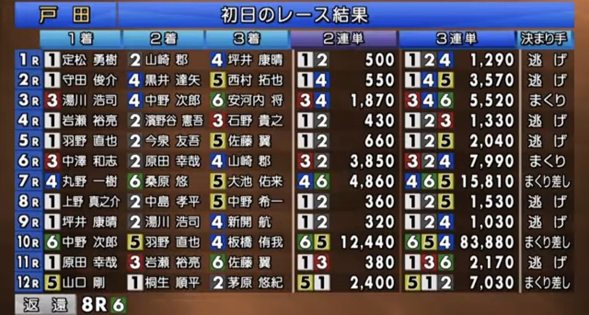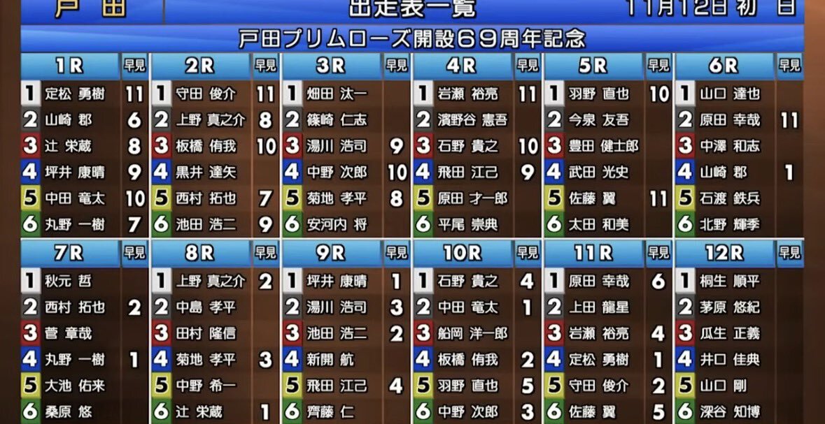 〈GⅠ 戸田プリムローズ開設69周年記念〉 準優勝戦メンバー決定しました! 10R ①#今泉友吾 選手(東京) ②#黒井達矢 選手(埼玉) ③#井口佳典 選手(三重) ④#中野次郎 選手(東京) ⑤#定松勇樹 選手(佐賀) ⑥#中島孝平 選手(福井) 11R ①#山口剛 選手 (広島) ②#茅原悠紀 選手(岡山)