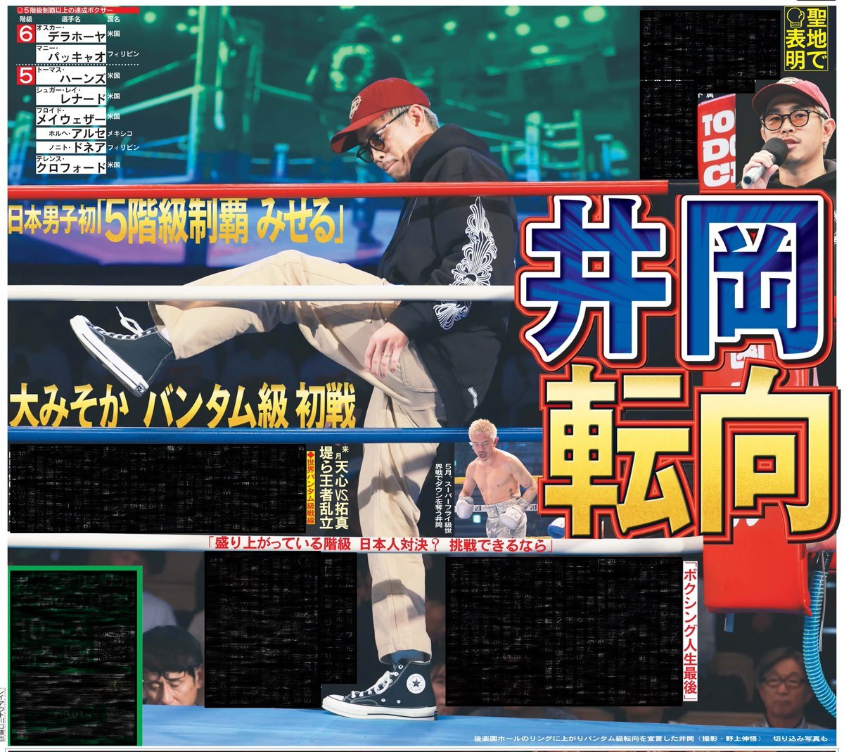 本日30日の東京最終版終面はボクシング元WBA世界スーパーフライ級王者井岡一翔選手🥊バンタム級転向を表明し、日本男子初の5階級制覇に照準❤️‍🔥詳しくはニッカンで📰 #井岡一翔 #ボクシング #バンタム級転向 #那須川天心 #井上拓真 #堤聖也 pic.x.com/DhC8EZCzLg