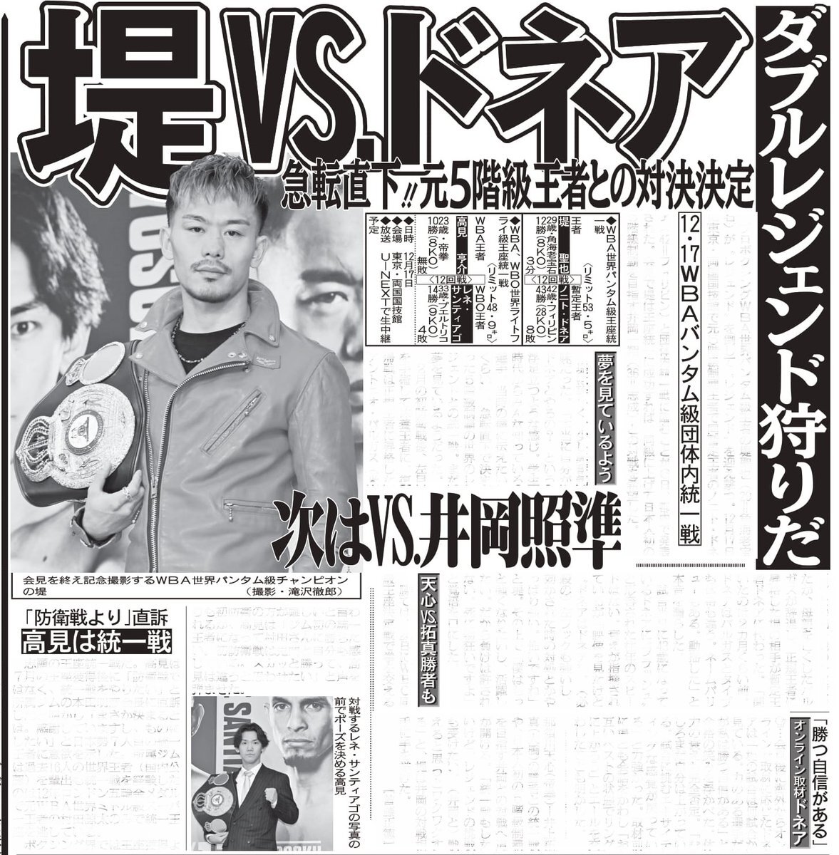 本日7日の東京・スポーツ面6面はボクシングWBAバンタム級団体内統一戦🥊同級王者堤聖也選手が同暫定王者ノニト・ドネア選手と激突❤️‍🔥12.17両国国技館でゴング🥊詳しくはニッカンで📰 #堤聖也 #ノニト・ドネア #井岡一翔 #高見亮介 #レネ・サンティアゴ #ボクシング pic.x.com/nYpLMwITmW
