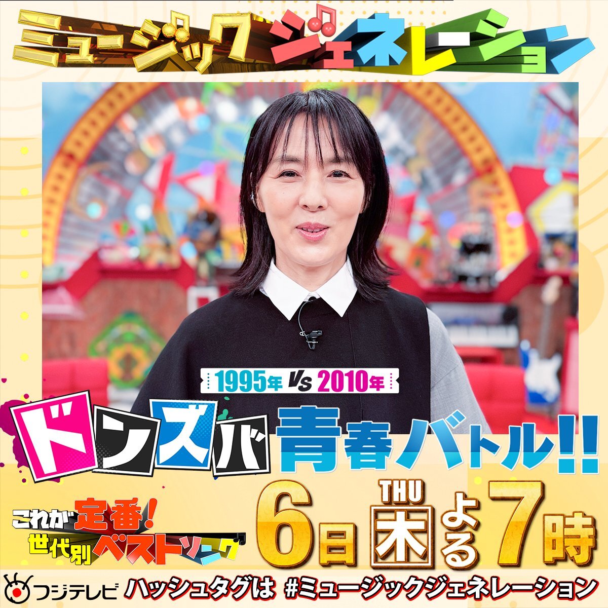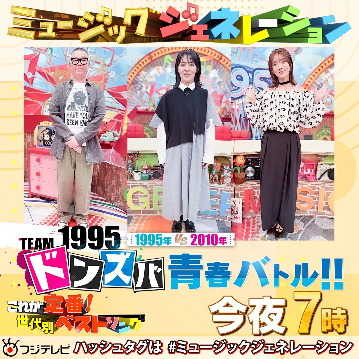 明日6(木)よる7️⃣時~🕖 #フジテレビ 系📺 #ミュージックジェネレーション 新企画 #ドンズバ青春バトル! ゲストが青春を過ごした年のヒット曲や流行で対決! 1995年 #MrChildren #中島みゆき #岡本真夜 #安室奈美恵 #Windows95 #野茂英雄 #アムラー #PHS TEAM1995 #井森美幸 #お料理BANBAN pic.x.com/2pGGEbpK53
