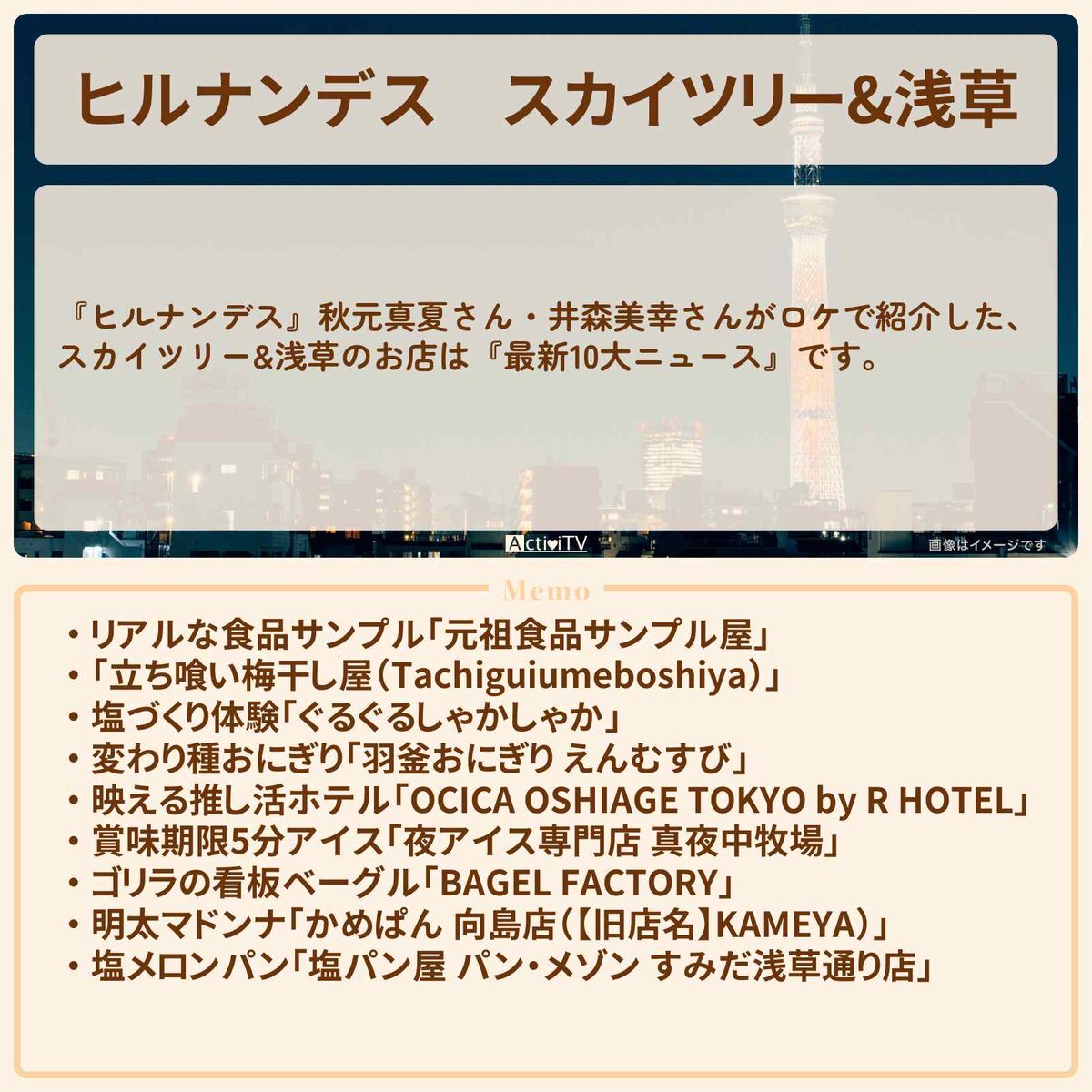 #ヒルナンデス スカイツリー&浅草『最新10大ニュース』のお店まとめ #秋元真夏 #井森美幸 がロケ 元祖食品サンプル屋 立ち喰い梅干し屋 ぐるぐるしゃかしゃか えんむすび 真夜中牧場 BAGEL FACTORY かめぱん パン・メゾン 詳しくは👉 activitv.com/entry/hirunan_… #南原清隆 #吉村崇 #小倉優子 #梅澤廉 pic.x.com/tMxP6Gkbo5