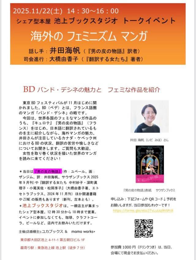 #翻訳する女たち刊行1周年記念❣️ と勝手にネーミング(^^;) 11/22 土 14時30分~16時 東京大田区 #池上ブックスタジオ にて #井田海帆 さんトークイベント 「海外のフェミニズムマンガ」 参加費1000円(ドリンク付) 私は司会をします。翻訳する女性の話が好きなんです。 #男の皮の物語 面白いよー x.com/umipan/status/…