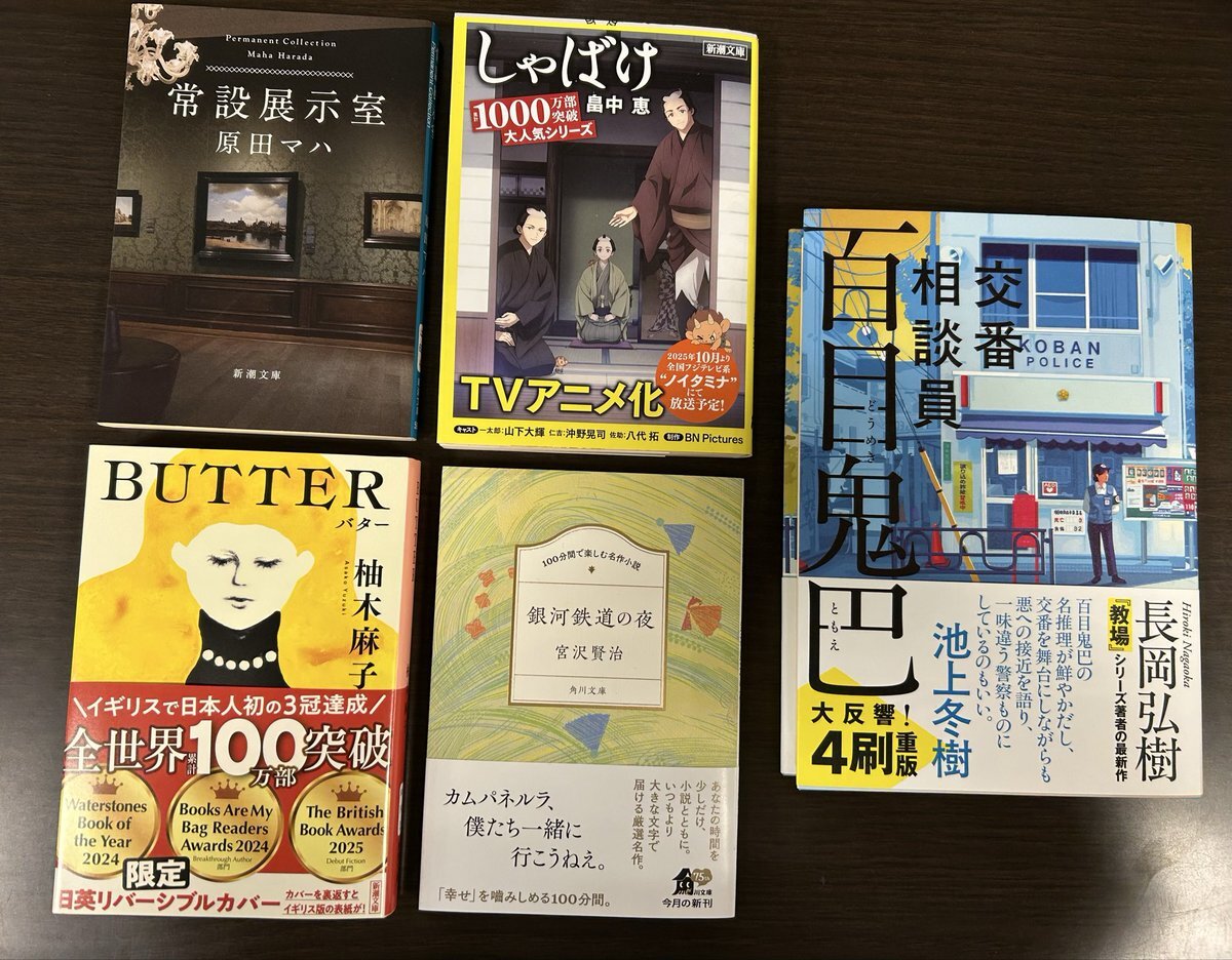【#たかつ紀スタッフ いち推し本!】 今月はこちらの5冊💁 ぜひぜひ秋の夜長に読書をお楽しみください🌕🍂🍁 #常設展示室 #しゃばけ #BUTTER #銀河鉄道の夜 #交番相談員百目鬼巴 #おすすめ本 店員おすすめPOPはぜひ店頭でご覧ください♪(b) 棚B08-08 文学新刊 pic.x.com/oFblTTrOeh