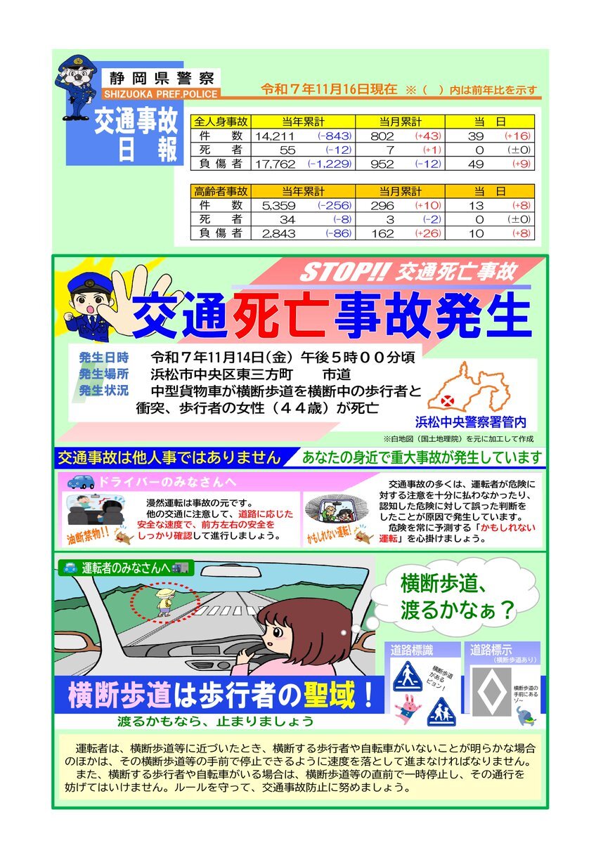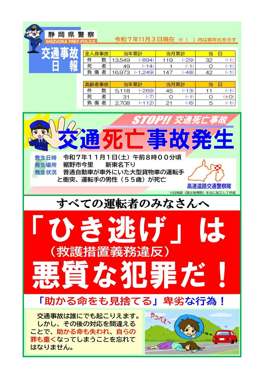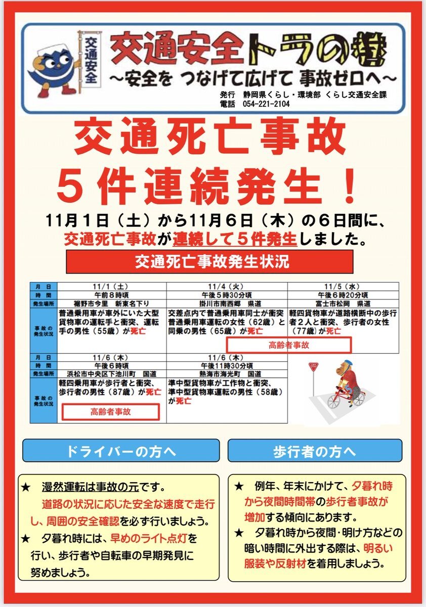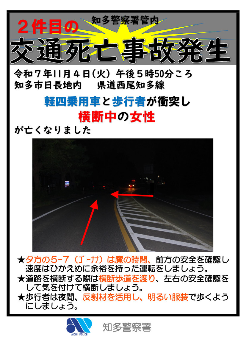 \ #交通死亡事故 が連続で発生しています!/ 11月1日から11月6日の6日間の間に #交通死亡事故 が相次いで発生し、 6人の尊い命が失われています。 漫然運転は事故の元です。 夜間に外出する際は、明るい服装や反射材を着用しましょう❗️ pic.x.com/JKCtb0EpAZ