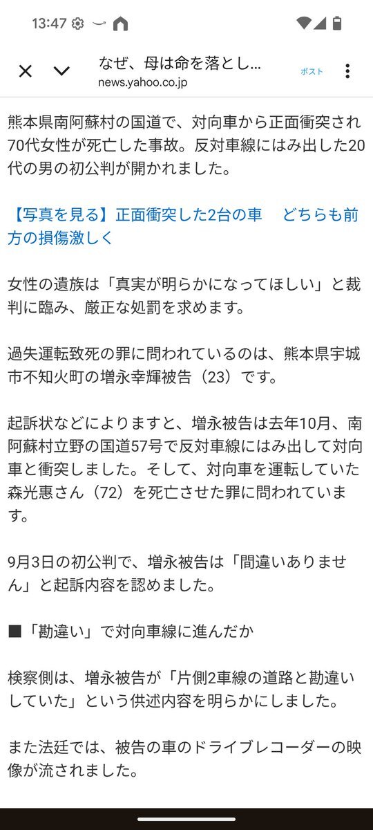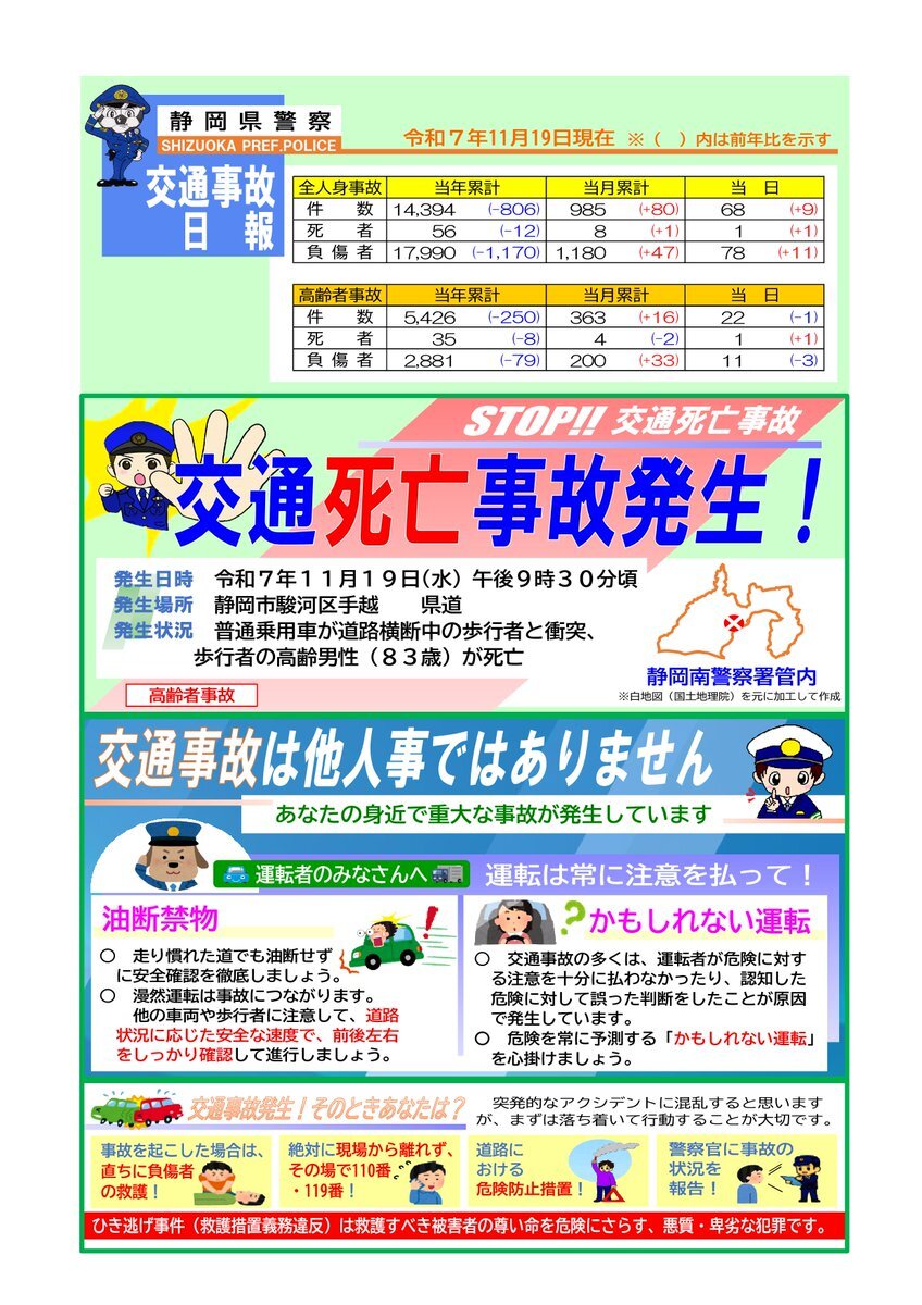 #交通死亡事故 福島県で4日間に4件4人 2か月連続の多発注意報[11/18]年計49件50人、前年より12日早く #trafficlip #AccidentsFatal 福島県で、11月14日からの4日間に交通死亡事故が相次いで計4件4人発生したことを受け、福島県交通対策協議会は19日付で、2か月連続と… news.jp/i/136386162804…